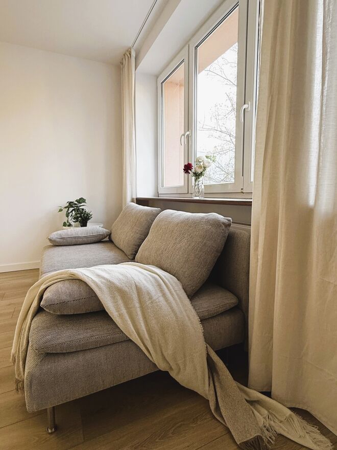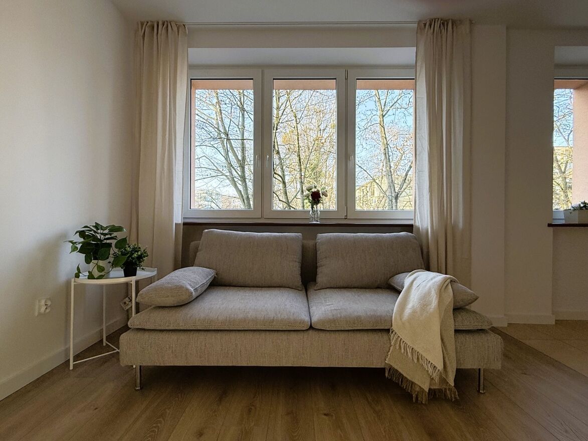 Okna z salonu i kuchni wychodzą na zadrzewiony skwerek, dzięki czemu latem nie jest gorąco.