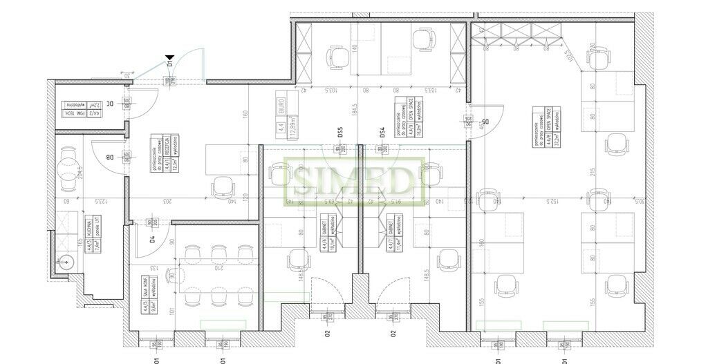 Aktualny układ pomieszczeń to 4 pokoje do pracy , recepcja w