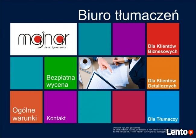 Majnar to profesjonalne biuro tłumaczeń, które stara się sprostać wszelkim wymaganiom Klienta. Tłumaczenia oferujemy nie tylko przedsiębiorstwom, ale także instytucjom oraz osobom fizycznym z całej Polski .Wykonujemy różnego rodzaju tłumaczenia z i na język rosyjski, zarówno literatury pięknej, naukowej, jak i specjalnej (kontrakty, umowy, pisma, strony internetowe, prezentacje firm, tłumaczenia techniczne z poszczególnych branż etc).Oprócz niskich i konkurencyjnych stawek, nasza oferta to również gwarancja krótkich terminów, a także zachowania pełnej poufności.