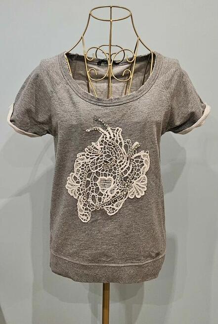 Bluzka w kolorze ciemnoszarym ze srebrnym nadrukiem i napisem Love wyszytym złotymi cekinami. Stan idealny. Krótkie ...