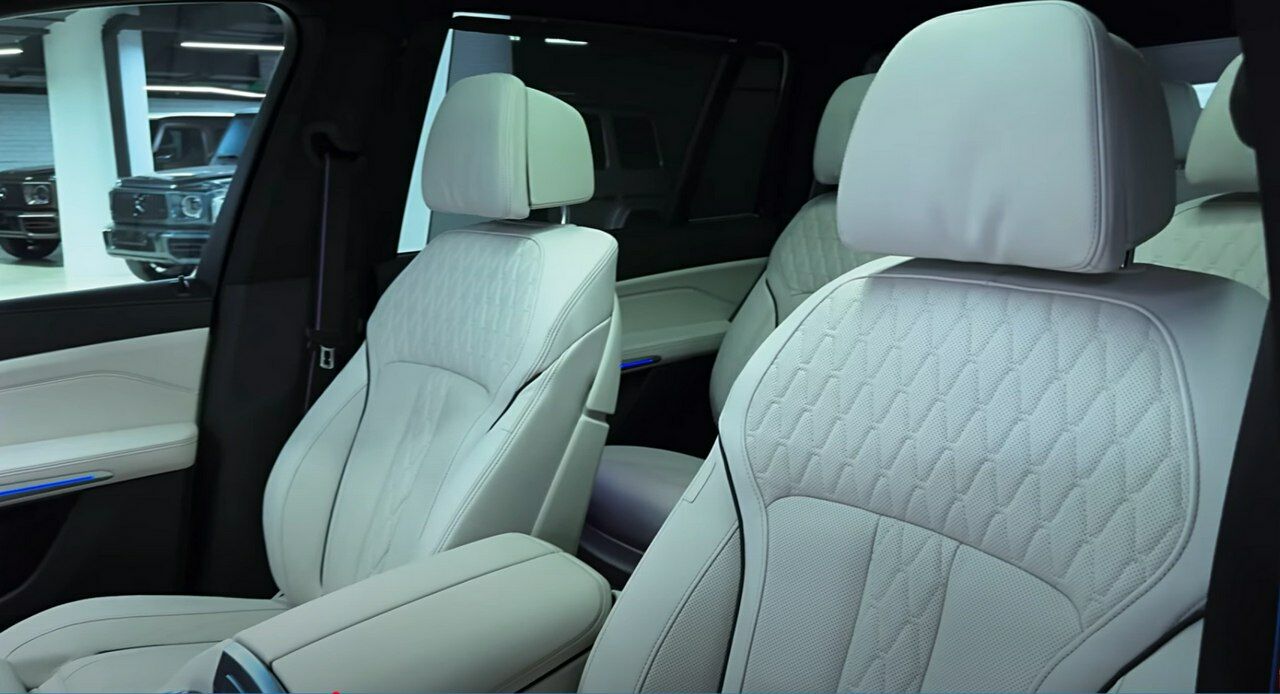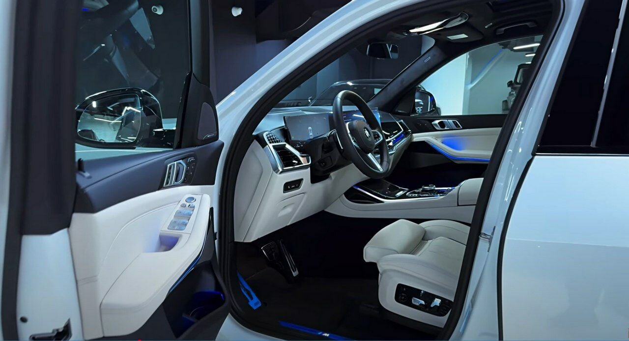 • Exclusive – masaż i wentylacja przednich foteli, szklany dach panoramiczny Sky Lounge, szklane aplikacje „CraftedClarity”, panel deski pokryty skórą BMW Individual