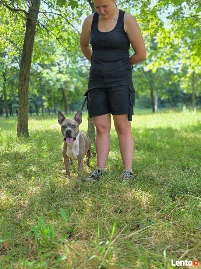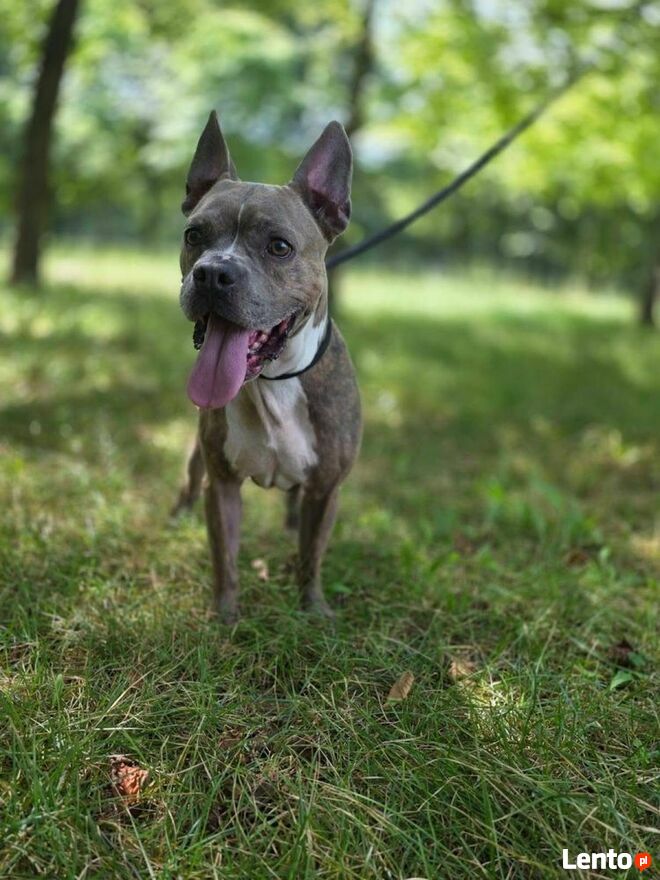 Na spacerze szuka kontaktu wzrokowego, ładnie chodzi na smyczy, spokojnie eksploruje teren i wita każdą napotkaną osobę.