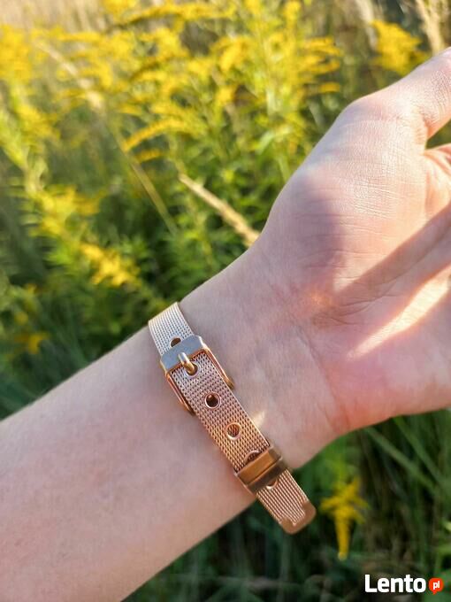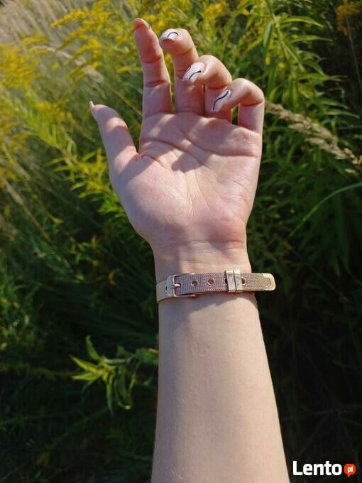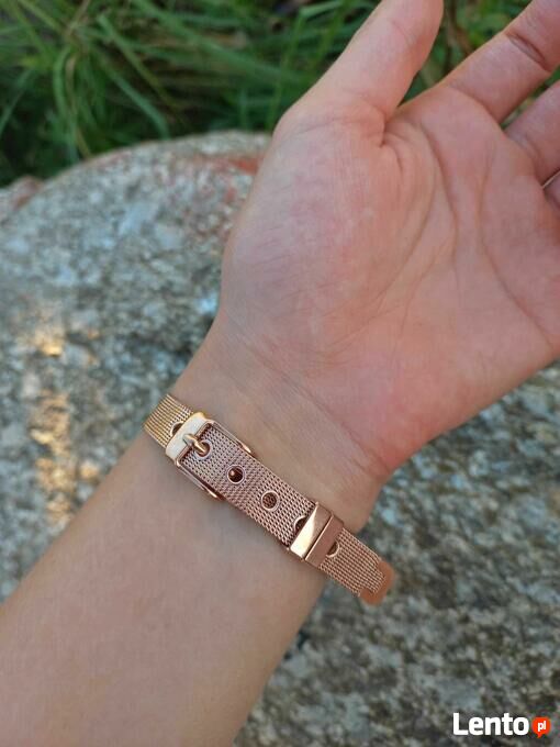 SUPER POMYSŁ NA ŚWIĘTA, SYLWESTRA ! !Bransoletka w kolorze różowozłotym, wykonana ze stali chirurgicznej, pokryta 18 karatowym złotem metodą elektroplated, która daje gwarancję długotrwałego utrzymania koloru. Ozdobiona w centralnej części dużym oczkiem z czarną emalią i cyframi rzymskimi. Forma paska od zegarka, idealnie dopasowuje się do nadgarstka i jest bardzo wygodna w użytkowaniu. Bransoleta z możliwością regulacji.