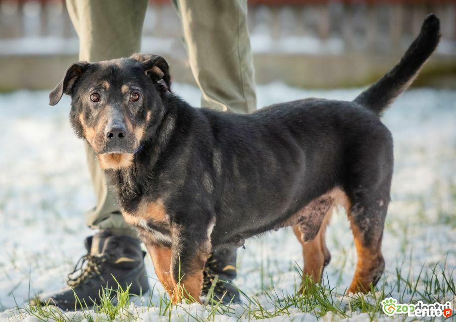 BULI - odebrany interwencyjnie, nigdy nie kochany, prosi o szansę i dom!Buli trafił pod naszą opiekę w ostatniej chwili. Zabrany w największe mrozy, stał przypięty ciężkim łańcuchem do dwóch spróchniałych desek... Pilnował rozpadającej się szopy... Właściciel alkoholik często zapominał go nakarmić, a jak karmił to dawał mu same kości :( W bardzo ciężkim stanie Buli został zabrany do lecznicy. Buli ma blizny na pysku, z pewnością był szczuty innymi psami :( Miał naprawdę ciężkie życie :( Teraz Buli jest już bezpieczny w hoteliku pod Warszawą. Uczy się życia w rodzinie i socjalizuje z resztą stada. Psiak jest bardzo spokojny, zrównoważony i wdzięczny za każdy miły gest. Chociaż mieszkał w budzie od pierwszego dnia trzyma czystość w domu. Jest bardzo spragniony uwagi i atencji człowieka. Podchodzi nieśmiało do opiekunów i prosi o uwagę. Bardzo ważny jest dla niego kontakt z człowiekiem, widać że mu tego brakowało i chce nadrobić teraz stracony czas. Do innych psów Buli jest łagodny, dogaduje się z nimi bez większych problemów. Psiak ma obecnie ok. 6 lat. Wygląda jak mix rottweilera z jamnikiem ;) Waży ok. 27 kg. To cudowny, kochany psiak, który bardzo potrzebuje domu i miłości :)