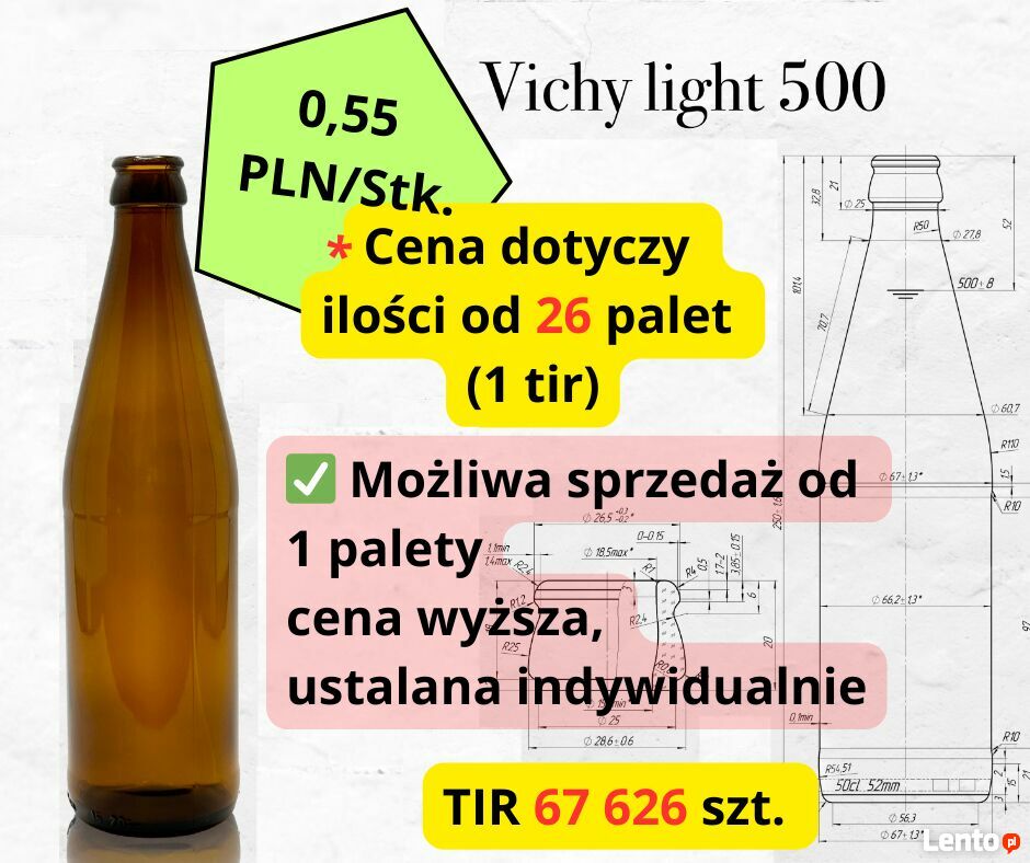 Oferujemy wysokiej jakości butelki szklane Vichy Light 500 ml – idealne dla producentów napojów i innych branż!* Cena: Atrakcyjna cena przy zamówieniu od 26 palet (1 TIR).