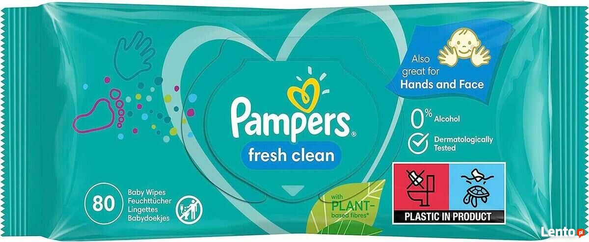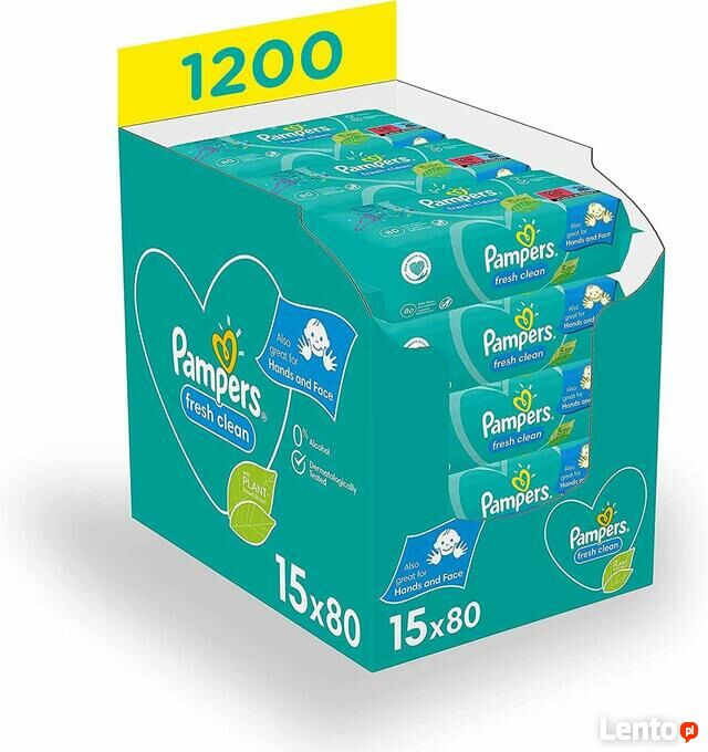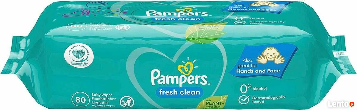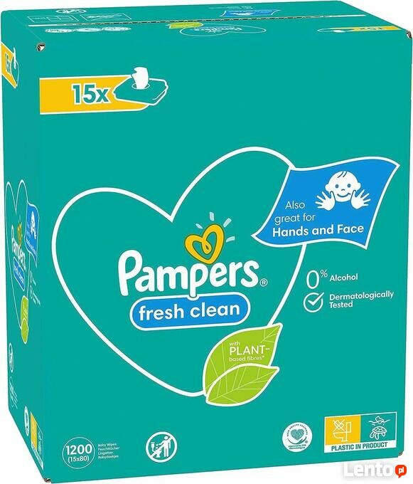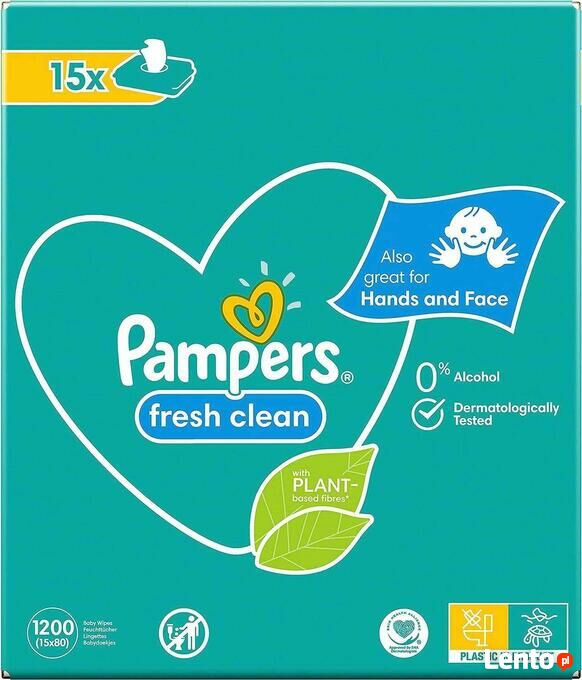 Pampers Chusteczki nawilżane Fresh Clean 15x80 sztOdkryj chusteczki dla niemowląt Pampers Fresh Clean Wszystkie nasze drogie ukochane zasługują na troskliwą opiekę, taką jak delikatne oczyszczanie. Właśnie dlatego chusteczki dla niemowląt Pampers Fresh Clean łączą zrównoważone nawilżenie z odżywczą formułą o neutralnym pH, która pomaga oczyścić delikatną skórę dziecka i utrzymać jej naturalny poziom pH. Te chusteczki dla niemowląt mają orzeźwiający zapach i sprawiają, że przewijanie dziecka jest jeszcze przyjemniejsze. Nie panikuj, zmieniając chusteczki dla niemowląt Pampers Fresh Clean. Łagodne czyszczenie pośladków, dłoni i twarzy Spraw, aby zmiana dziecka była niezapomnianym przeżyciem. Chusteczkami Pampers Fresh Clean Baby Chusteczki możesz delikatnie oczyścić nawet najbardziej wrażliwe obszary ciała dziecka, w tym pupę, dłonie i twarz. Balsam o delikatnym świeżym zapachu Chusteczki dla niemowląt Pampers Fresh Clean zawierają odświeżający balsam, który pokochacie Ty i Twoje dziecko. Ponadto balsam zapewnia zachowanie naturalnego pH skóry Twojego dziecka przy każdym użyciu. Bez alkoholu dla wrażliwej skóry Podczas czyszczenia wrażliwej skóry dziecka nic nie jest ważniejsze niż odpowiednia pielęgnacja. Chusteczki dla niemowląt Pampers Fresh Clean nie zawierają alkoholu, więc możesz używać ich każdego dnia bez obaw.