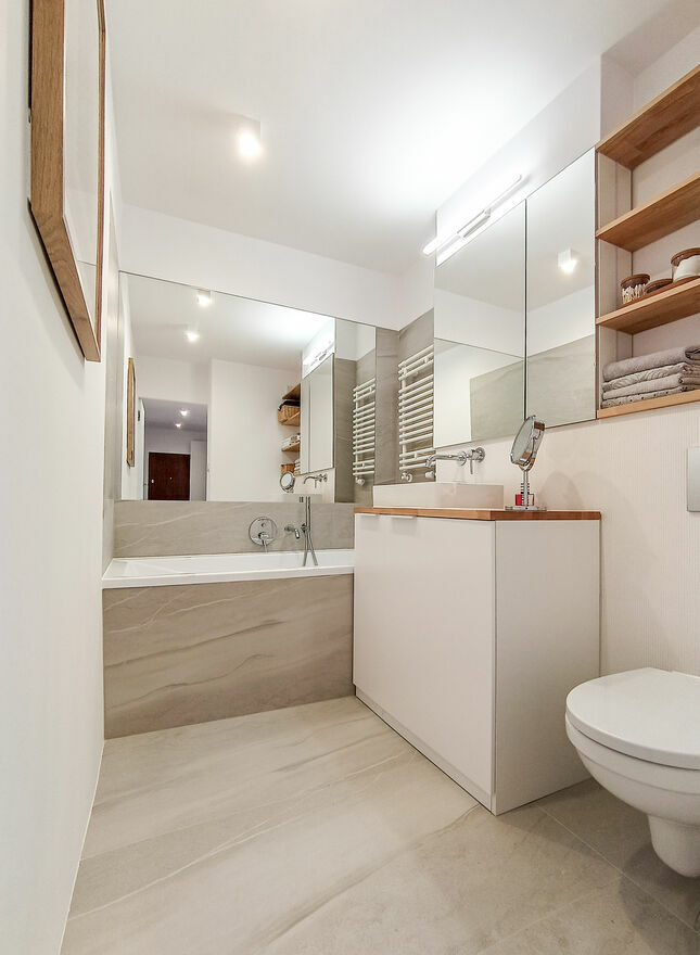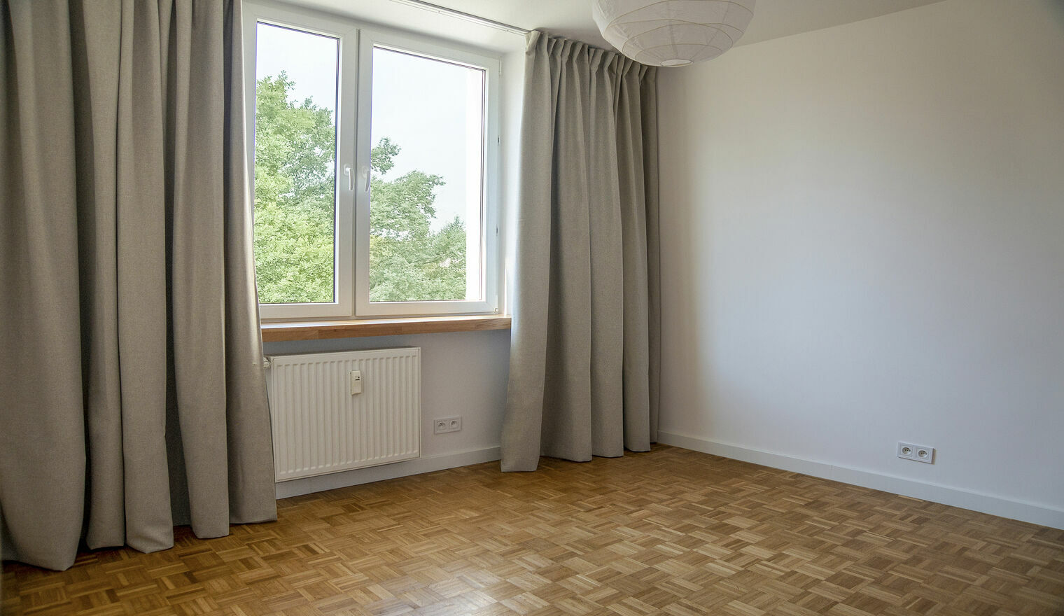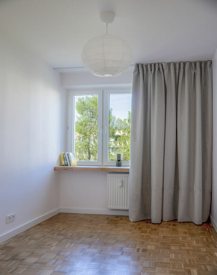 Z okien rozpościera się widok na piękną zieleń dorosłych drzew dzięki czemu mieszkanie jest niezwykle klimatyczne i kameralne.