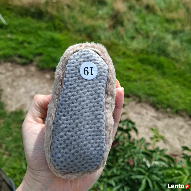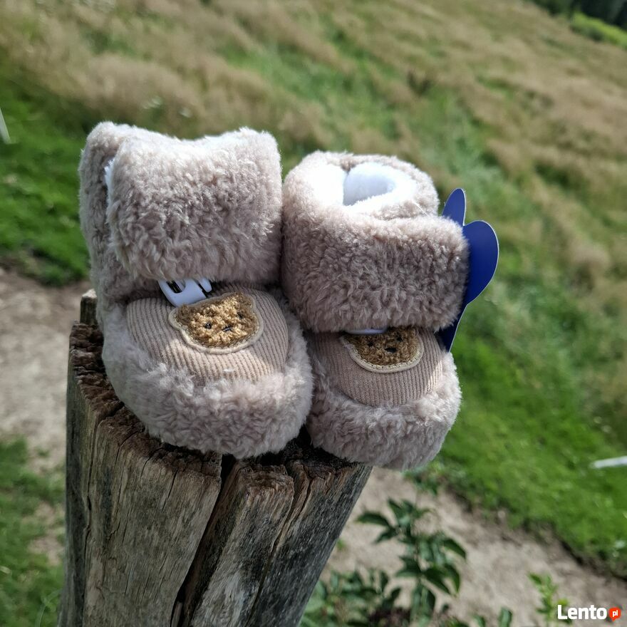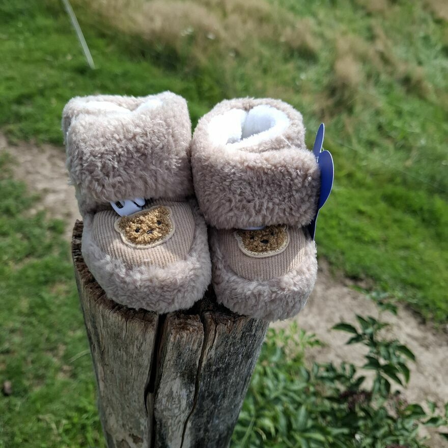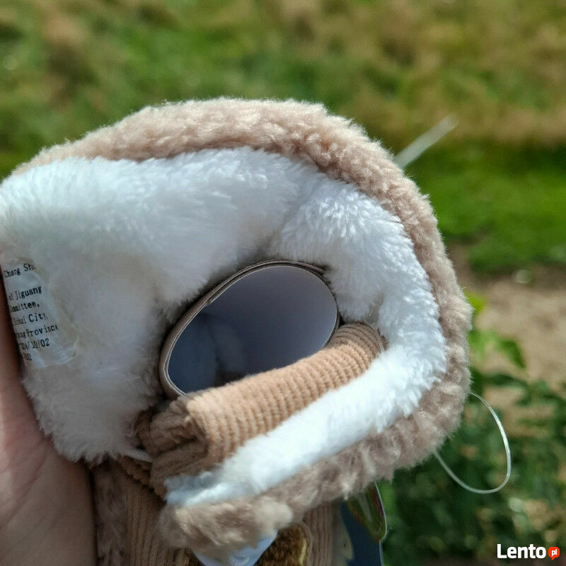 Śliczne zimowe buciki dla niemowlaka/chłopca w jasnym beżowym kolorze z motywem misia Wykonane z mięciutkiego materiału z puszkiem wewnątrz – idealne na chłodne dni, spacery czy podróże w wózku.Na przodzie znajduje się pluszowa głowa misia z uszkami i noskiem, a całość utrzymana jest w stonowanej, neutralnej tonacji. Buciki posiadają metkę i nie były używane. Długość wkładki: ok. 9,8 cm – idealne dla najmłodszych maluszków.