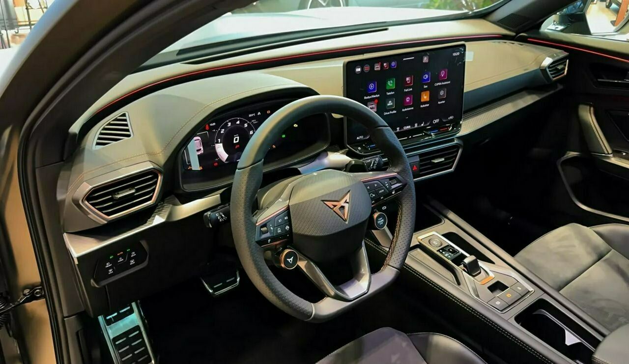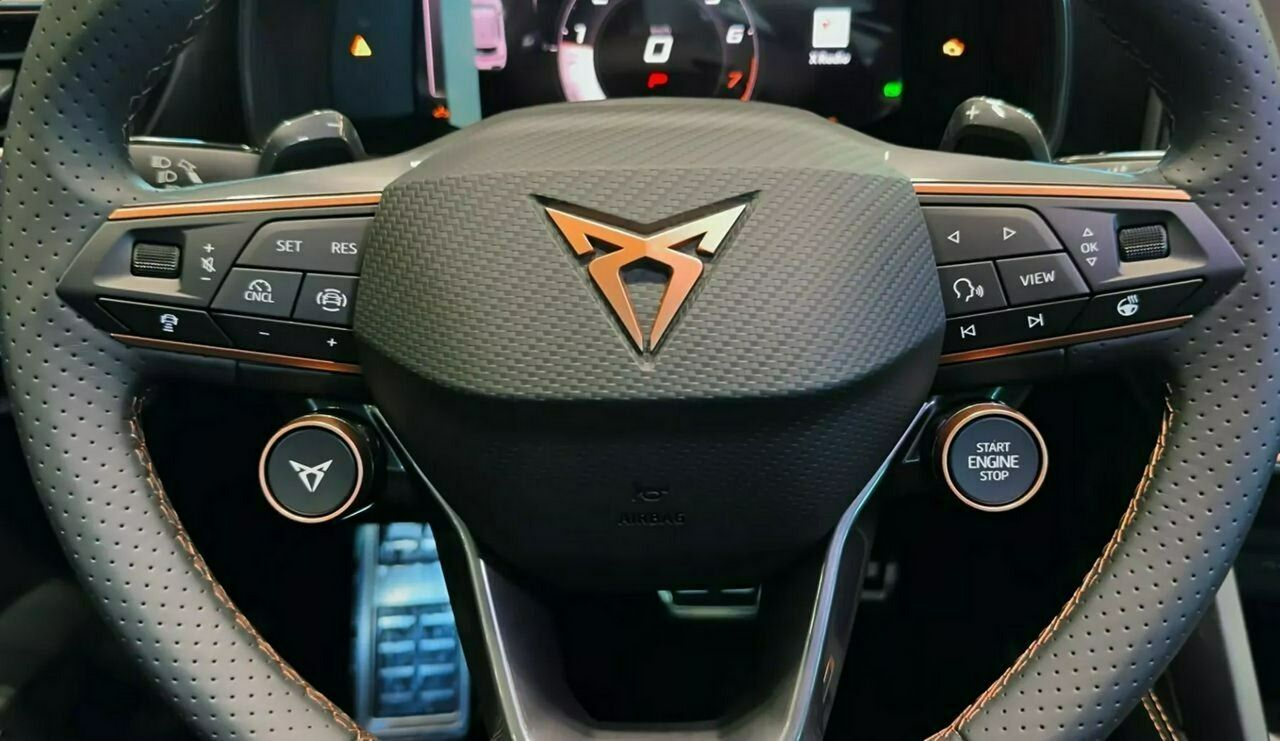 • Sportowa, podgrzewana kierownica wielofunkcyjna obszyta skórą z przyciskiem trybu Cupra i przyciskiem uruchamiania silnika