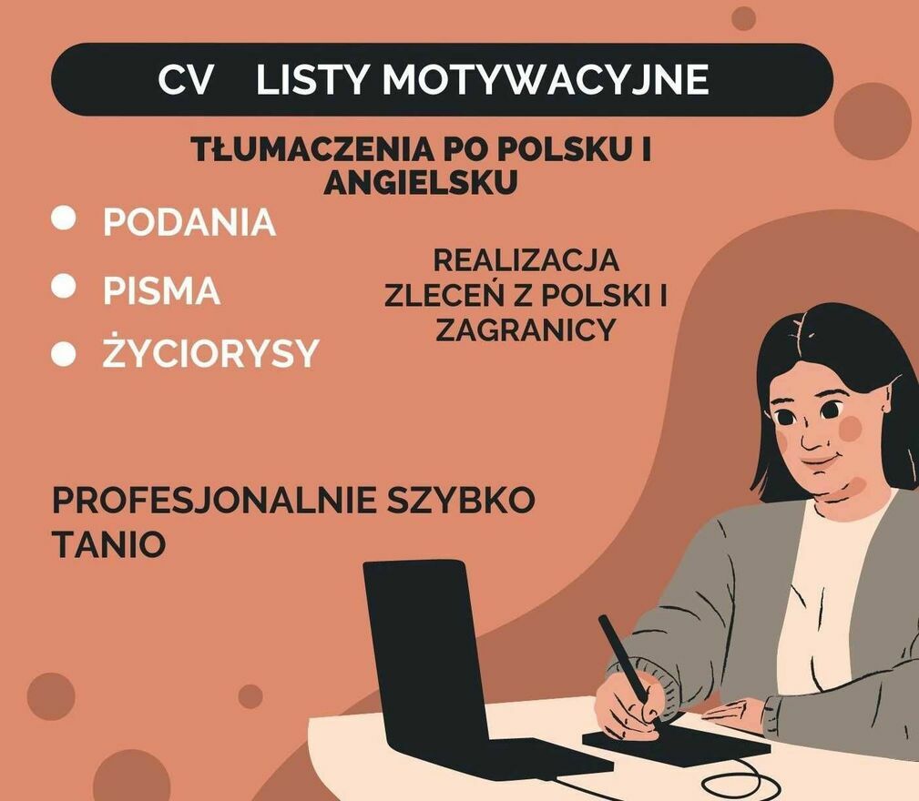 Profesjonalnie Szybko Tanio - Curriculum Vitae, List Motywacyjny, w języku polskim i angielskim oraz Podanie, Pismo !10-letnie doświadczenie w tworzeniu CV i innych pism. Doskonale wiemy, co powinno znaleźć się w aplikacjach. Zajmujemy się pisaniem podań, pism na wszelkiego rodzaju stanowiska ze wszystkich branż. Liczy się pierwsze wrażenie. Każdy o tym doskonale wie. Jeżeli szukasz pracy - jedyna szansa to zwrócić na siebie uwagę. My zrobimy to za ciebie! Tworzymy CV także dla osób wchodzących na rynek pracy, bez doświadczenia zawodowego, powracających z emigracji, urlopów macierzyńskich, po dłuższej przerwie etc. Pisma redagowane według nowoczesnych standardów i wzorów. Czytelny i wyrazisty układ pozwoli wyróżnić się spośród innych kandydatur. Treść dopasowana do profilu poszukiwanej pracy i potencjału kandydata !