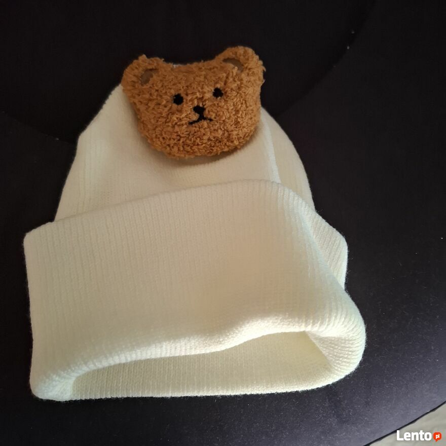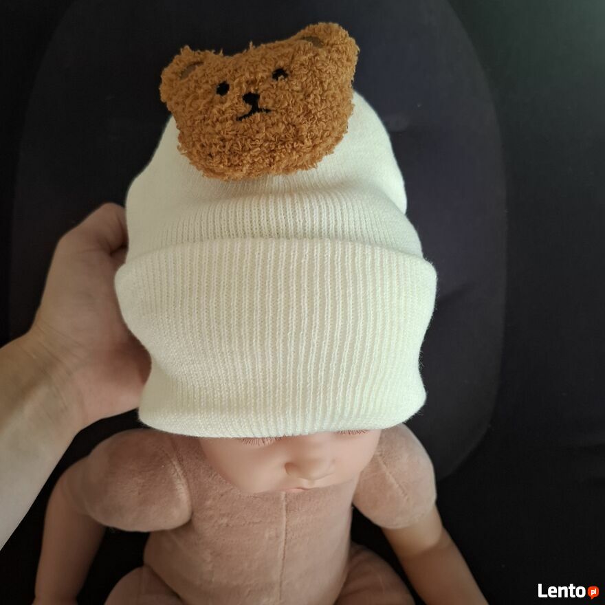Sprzedam uroczą czapkę niemowlęcą dla chłopca w kolorze kremowo-białym. Wykonana z bawełny grubsza idealna na chłodniejsze dni. Na przodzie znajduje się słodka aplikacja misia , która dodaje czapce wyjątkowego uroku.3-1roku