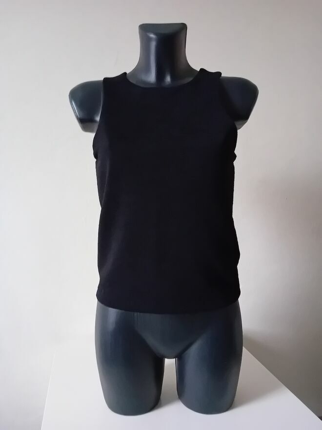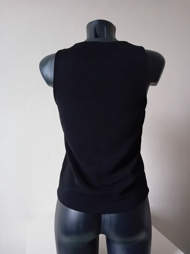 Czarna bluzka prazkowana, damska. Dopasowana, bez rękawów, stylowa. Idealna na wiele okazji.