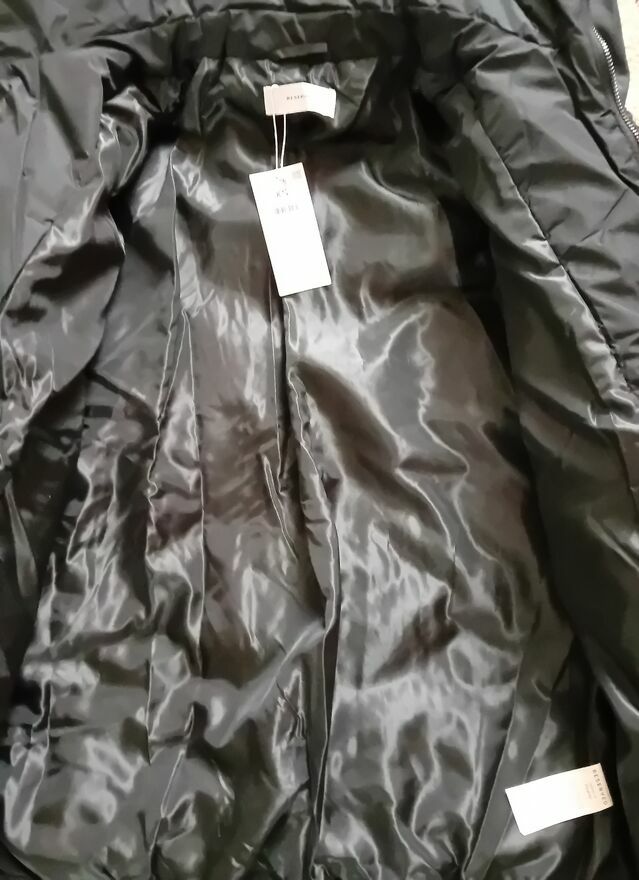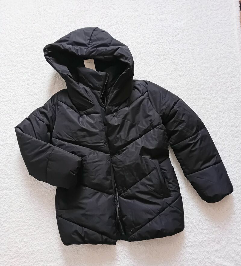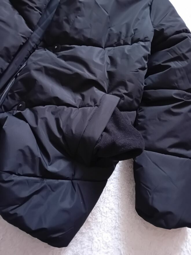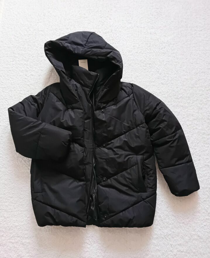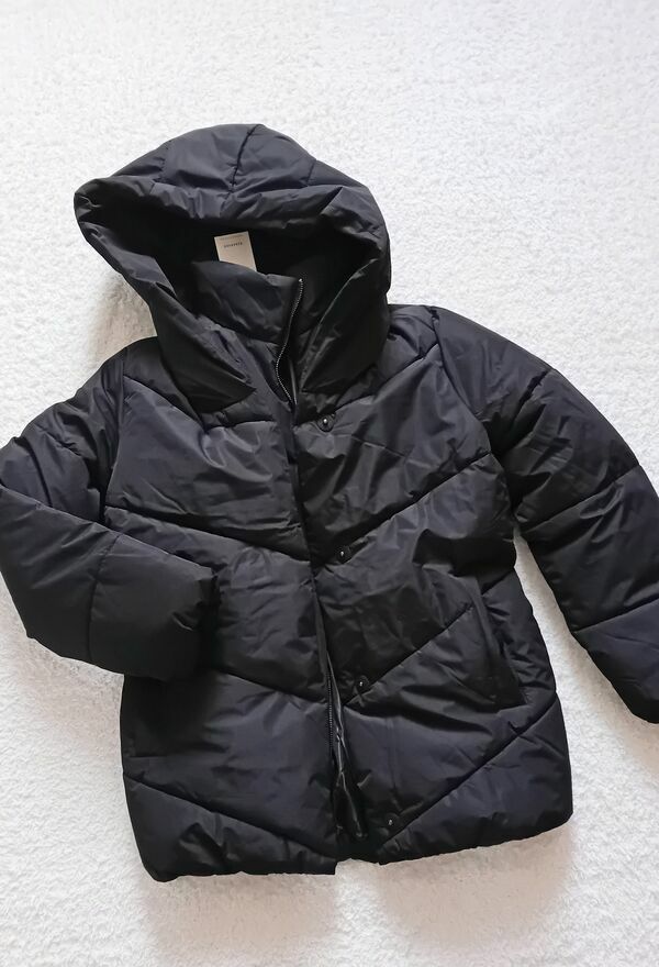 Nowa czarna puchowa kurtka z kapturem. Doskonała opcja na zimę, zapewniająca ciepło i wygodę. Wykonana z wysokiej jakości materiałów, idealna na chłodne dni.Rozm xs/s.