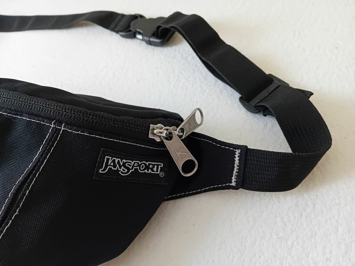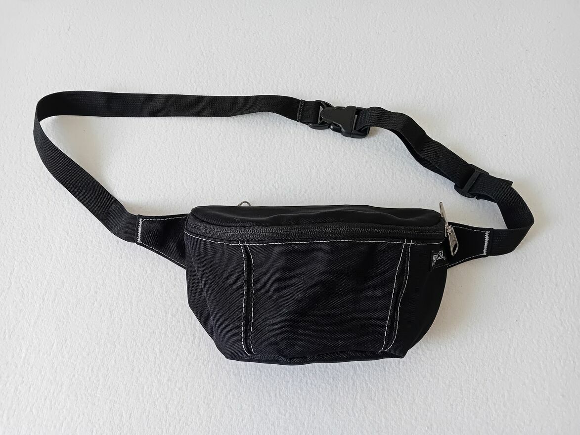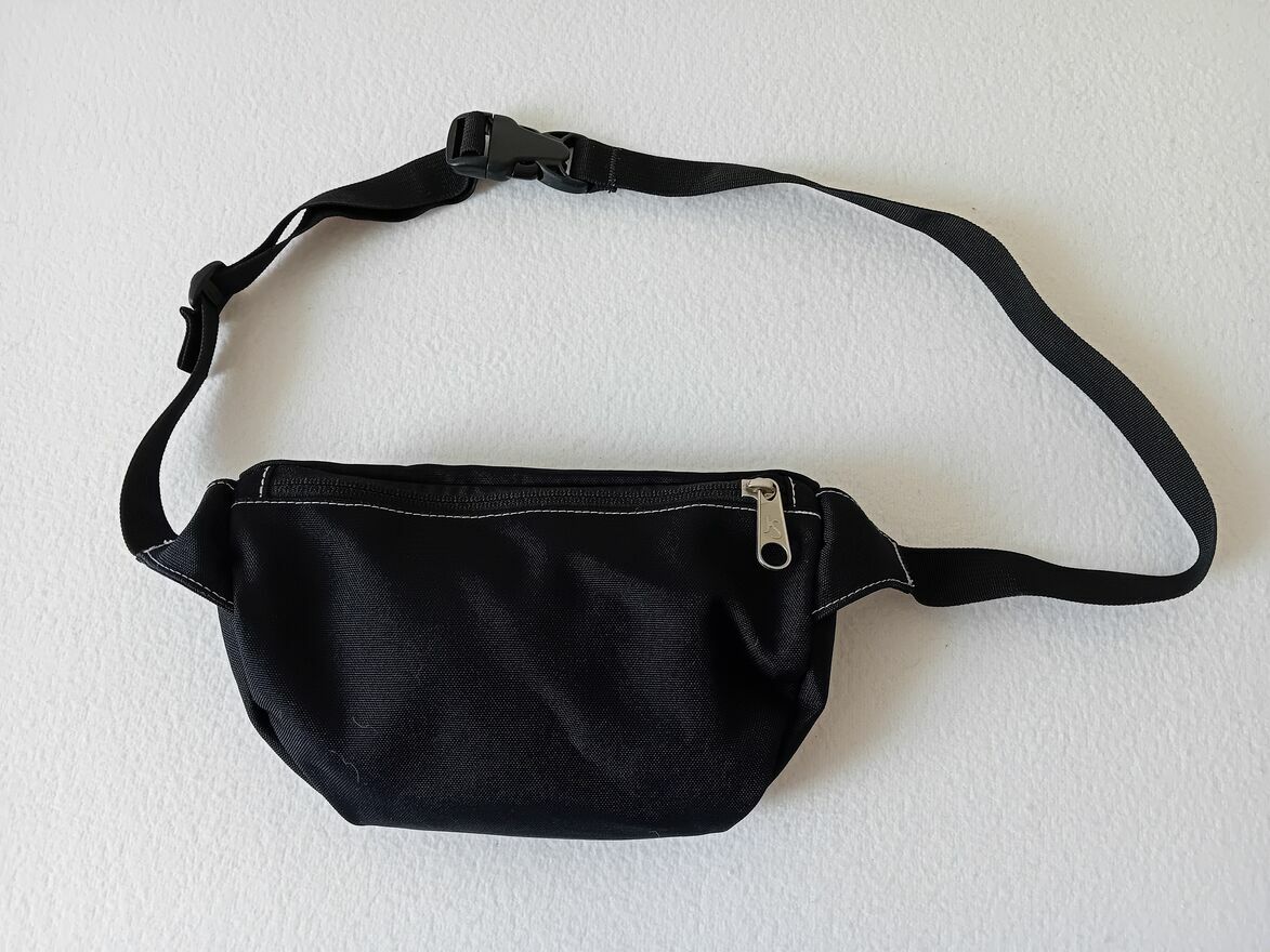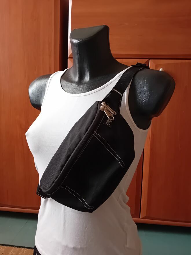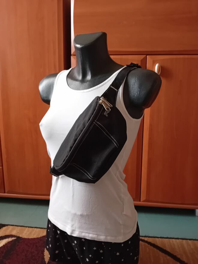 Czarna saszetka nerka. Można nosić na ukos przez ramię, lub na pasie.