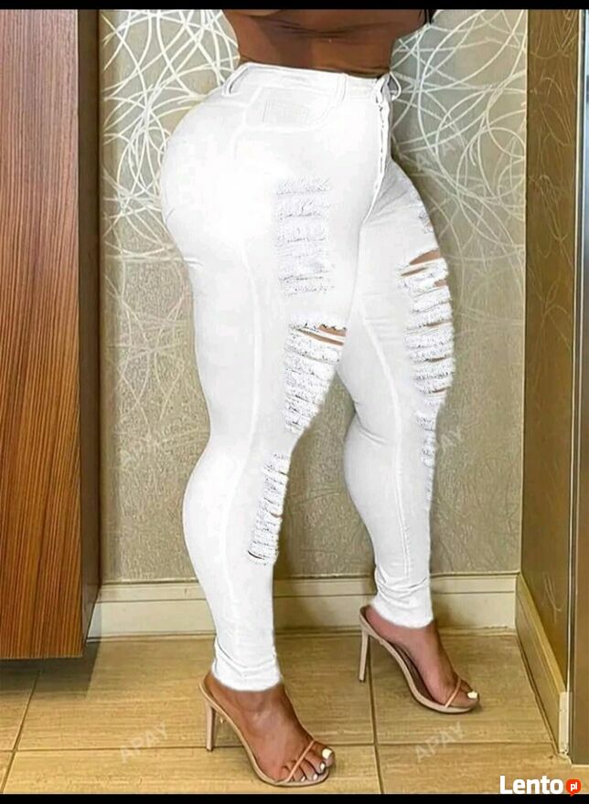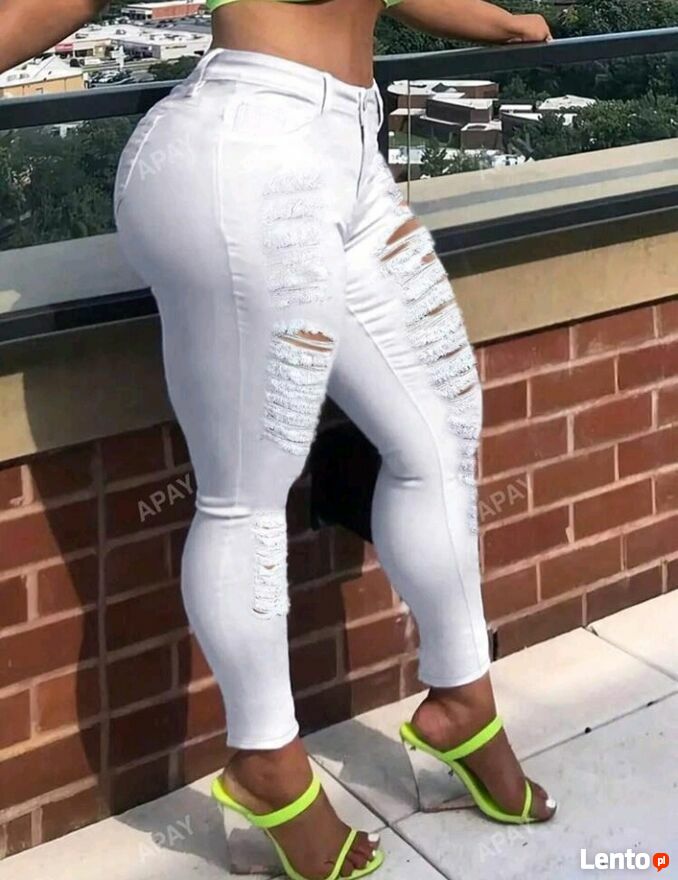 Damskie obcisłe dżinsy z wycięciami, z przetarciami i kiesze