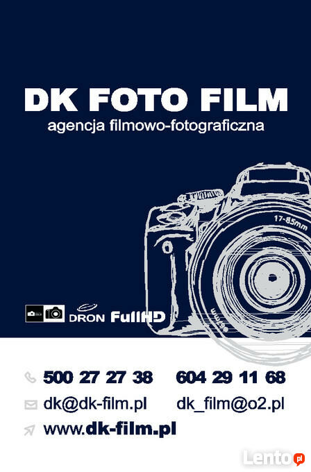 Firma DK FOTO FILM proponuje Państwu profesjonalną obsługę: wesel, komunii, chrzcin, imprez okolicznościowych itp. Cechuje nas doświadczenie w branży foto - video poparte kilkuletnim stażem w studiach video, a także w lokalnych stacjach telewizyjnych. DK FOTO FILM do każdej realizacji podchodzi indywidualnie, jak do kolejnego nowego wyzwania. Staramy się, aby Państwa film był jedyny i niepowtarzalny. Film jest skróconą wersją Państwa uroczystości, w którym zawarte są najistotniejsze chwile. Doświadczenie naszych operatorów sprawi, że Wasz film będzie ciekawy, a także będzie wieczną pamiątką. Filmy realizujemy techniką cyfrową Full HD.U nas znajdzie oferty kamer full HD, aparatów DSLR, dronów fotografów, fotobudki