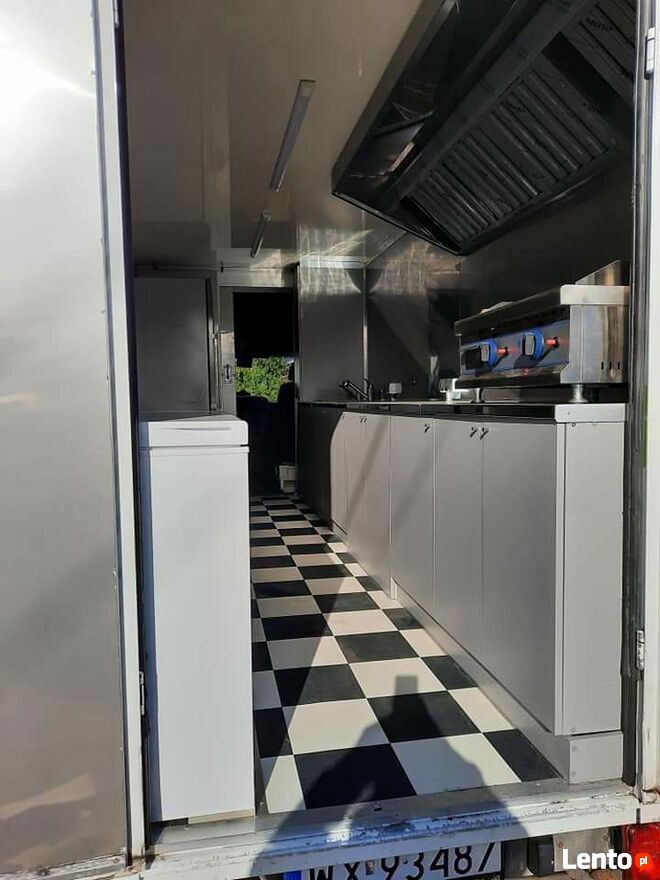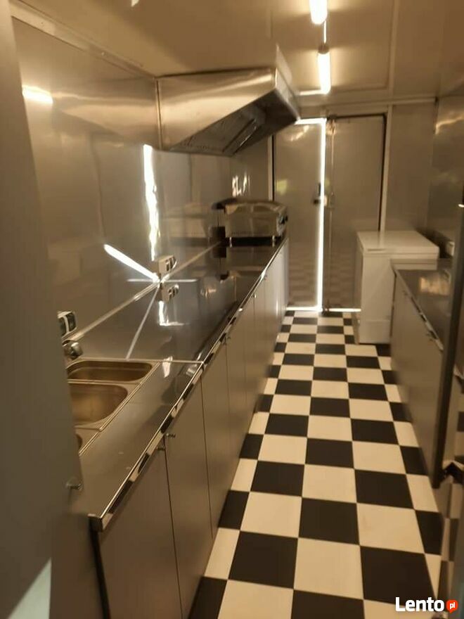 Wyposażenie: - Lodówka 370 l, zamrażarka skrzyniowa 300 l , okap gastronomiczny 2m wraz z wyciągiem 1800m3/h, zlew trzy komorowy,blaty z blachy nierdzewnej, niezależne zasilanie 230V pozwalające na pracę bez dostępu do zewnętrznej sieci energetycznej uzupełnione instalacją fotowoltaiczną .