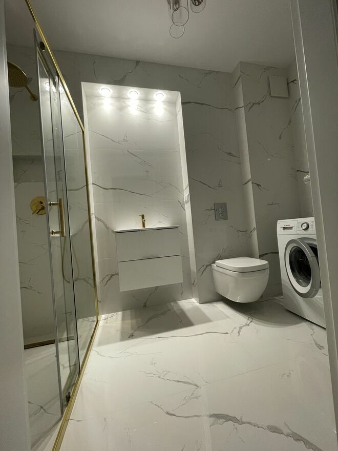 Aneks kuchenny w pełni umeblowany wraz ze sprzętami AGD (lodówka, piekarnik, płyta indukcyjna, zmywarka), łazienka wyposażona w pralkę.