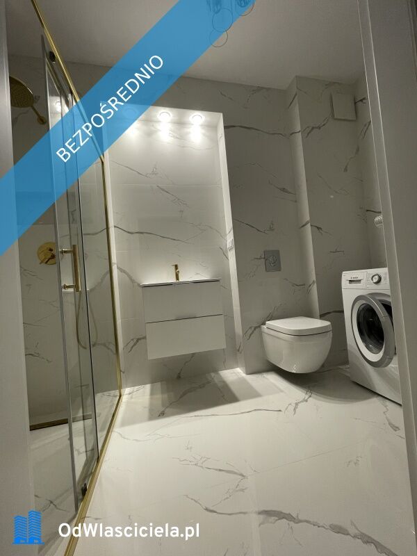 Aneks kuchenny w pełni umeblowany wraz ze sprzętami AGD (lodówka, piekarnik, płyta indukcyjna, zmywarka), łazienka wyposażona w pralkę.