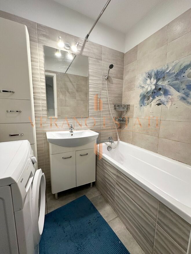 kuchnia (lodówka, kuchenka, piekarnik, szafki)łazienka z wanną i