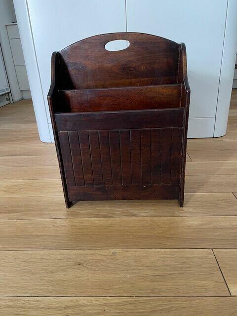 Uroczy gazetownik retro z metalowymi okuciami. Lite drewno. Stan idealny. Szer. 40 cm, głębokość 19 cm, wysokość 30 cm ...