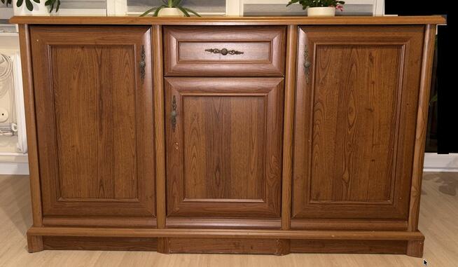 Drewniana, duża szafka pod telewizor. Kolor biały, blat brąz. W szafkach brak szkiełek. Do kompletu posiadam komodę. ...