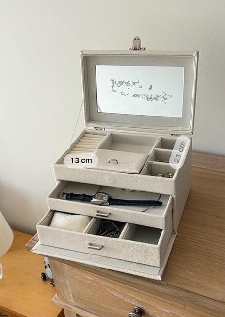 Szkatułka na biżuterię w kolorze kremowym, z trzema poziomami przechowywania i dwoma wysuwnymi szufladami. W pokrywie ...