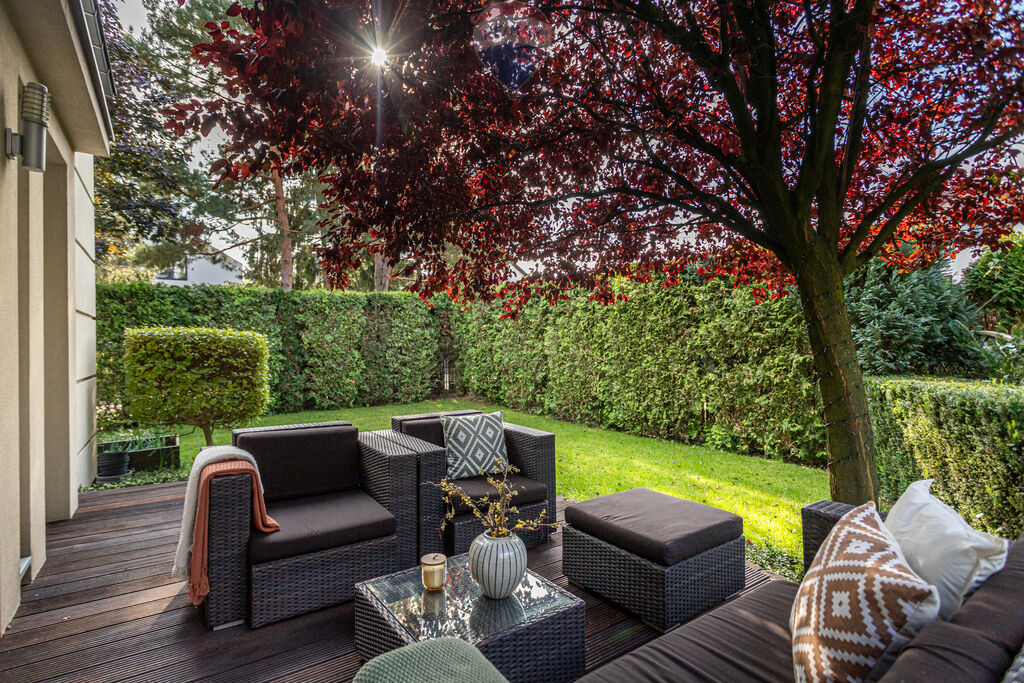 dwa kolejne tarasy i widok na ogród.