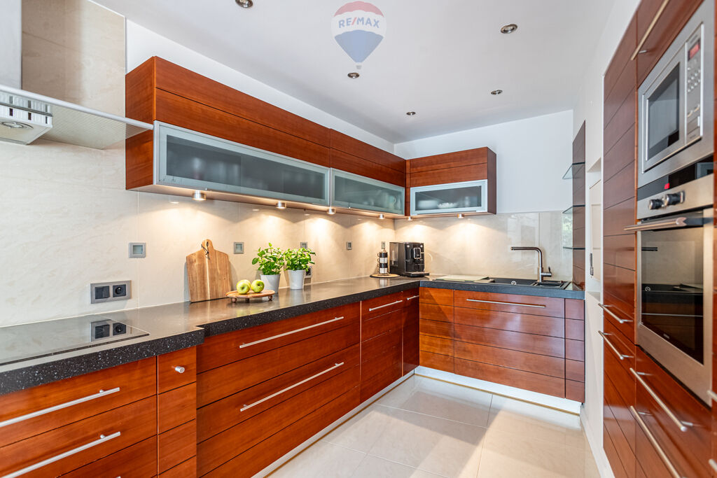Wnętrza wykończono w ponadczasowym stylu. Egzotyczne drewno i gres