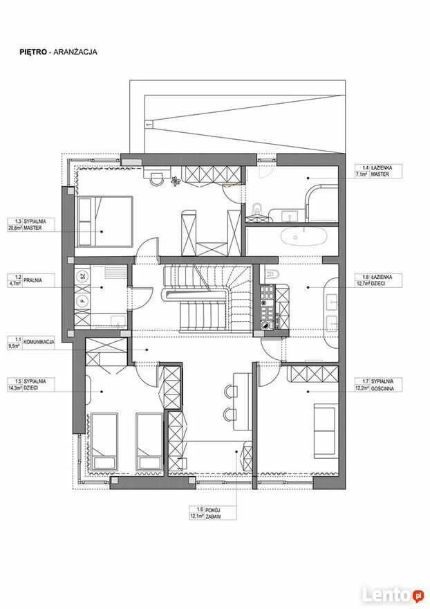 Na piętrze 3 sypialnie, w tym jedna z prywatną łazienką oraz druga