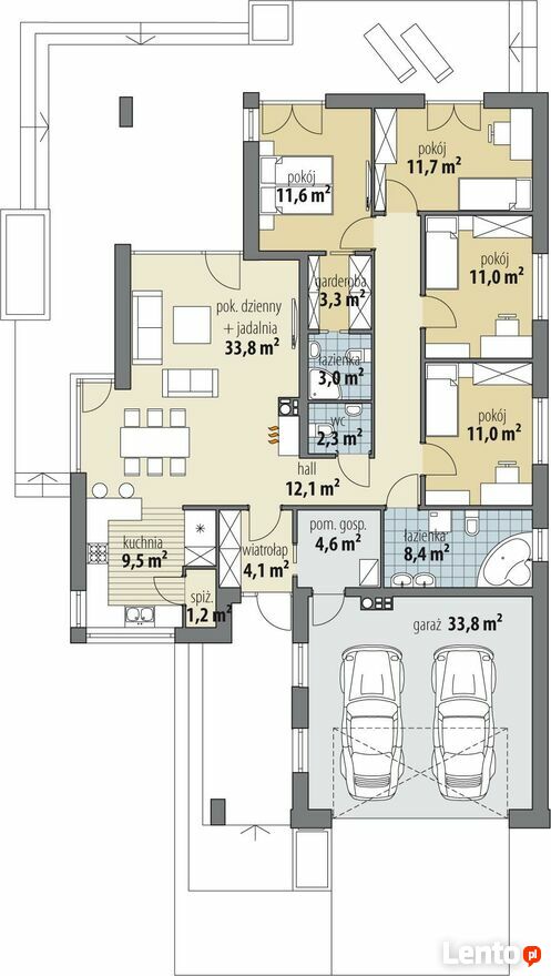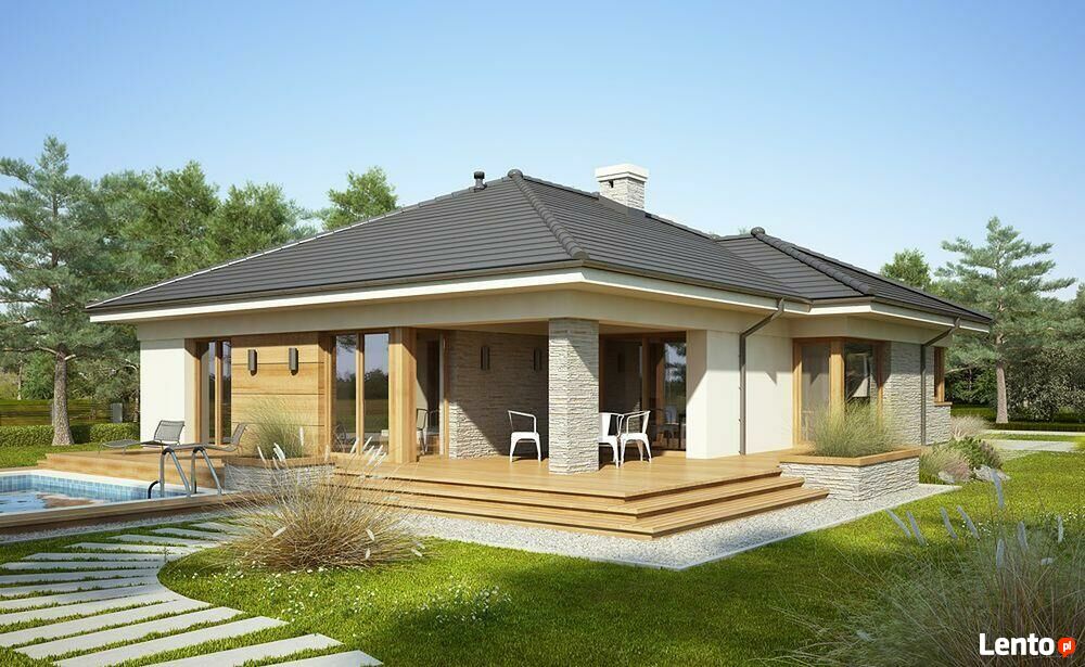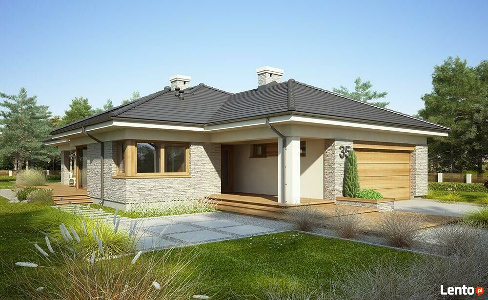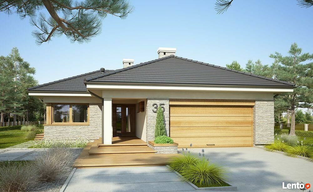 Dom Prefabrykowany Miriam IV to piękny, gustowny dom parterowy, którego główny atutem są cztery sypialnie w strefie nocnej, w tym jedna z nich zaprojektowana została jako moduł z osobną, prywatna garderobą i łazienką, oraz wyjściem na taras. Projekt ten idealnie wpasuje się w potrzeby 4-6-osobowej rodziny. Wygodny wiatrołap prowadzi do wnętrza domu. Część dzienna zlokalizowana została w lewym skrzydle. Przestrzeń kuchni powiększona jest o spiżarnię, która może posłużyć także jako schowek na drobne sprzęty porządkowe. Dodatkowo w hallu zaprojektowano niewielką toaletę. Dalszą część domu zajmuje strefa nocna - są to cztery sypialnie (jedna z garderobą i łazienką) oraz duża łazienka. W części gospodarczej przewidziano kotłownię i dwustanowiskowy garaż.Oferuję wykonanie: