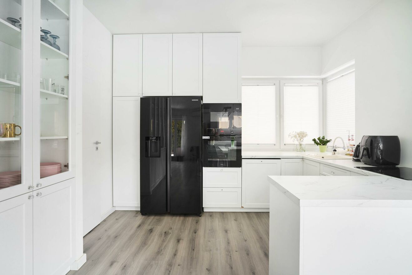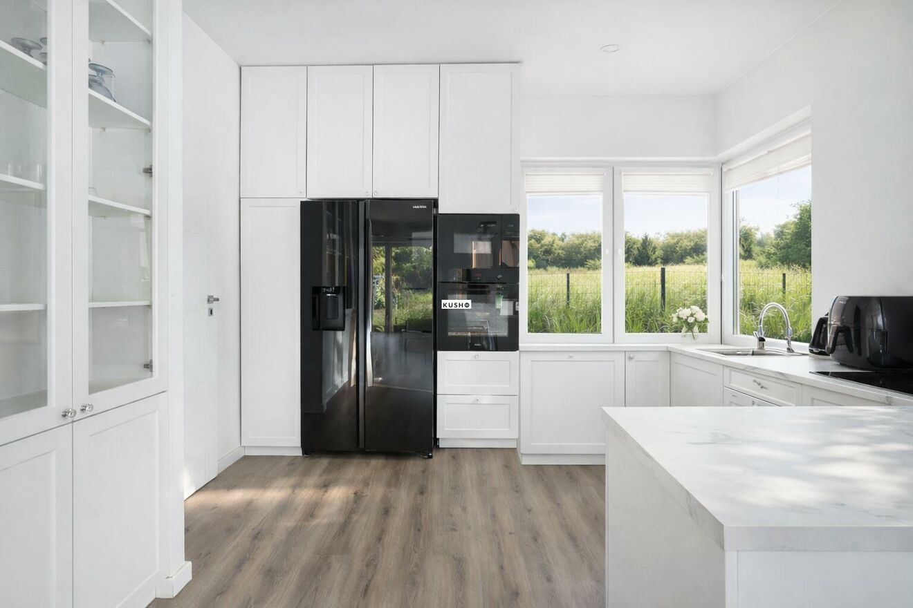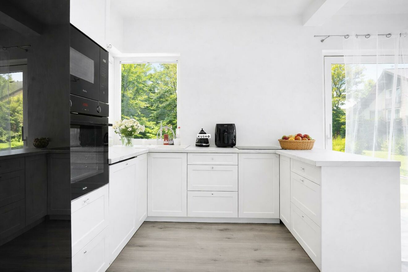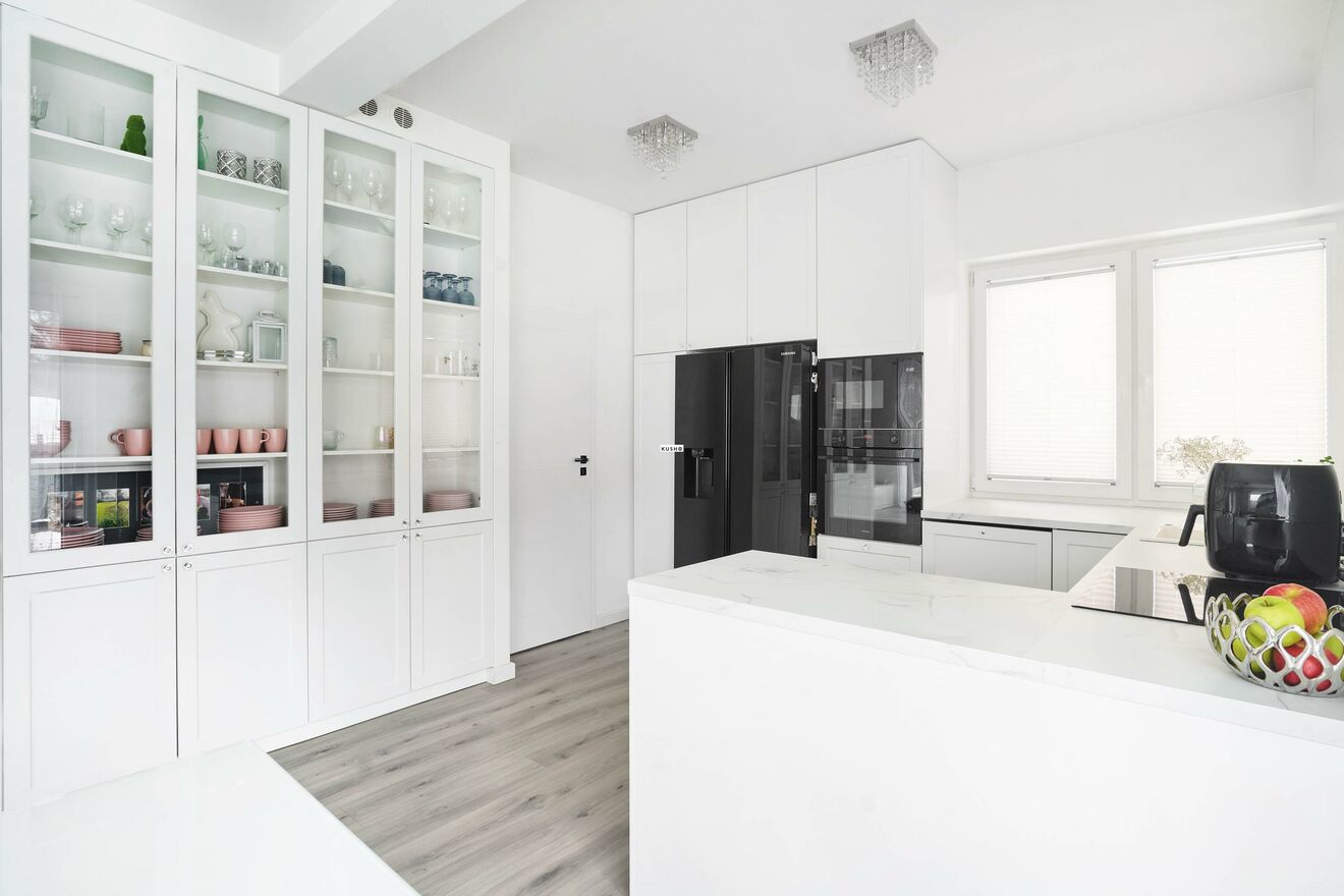 elegancka, w pełni wyposażona kuchnia w zabudowie (AGD: mikrofalówka Amica, piekarnik Amica, płyta indukcyjna Amica, lodówka Samsung Side by Side),
