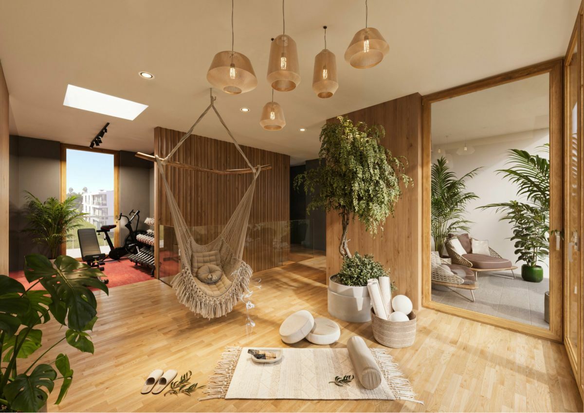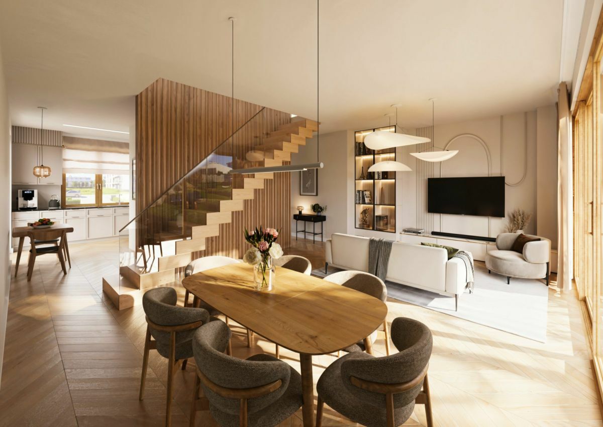 - Elegancka architektura domów zatopionych w zieleni, z wysokimi drewnianymi oknami i dopracowanymi detalami wykończenia, nadaje inwestycji prestiżowy i ponadczasowy charakter.