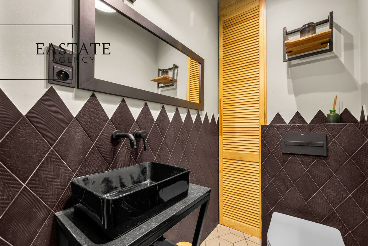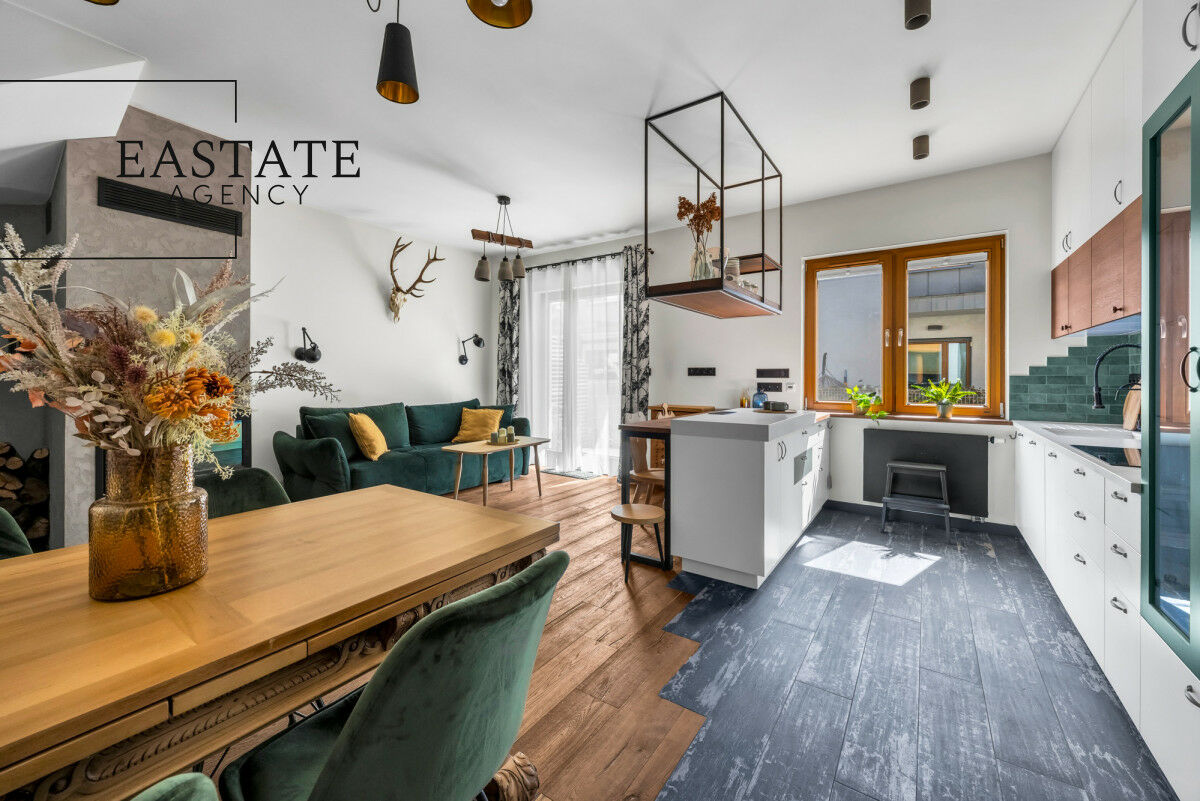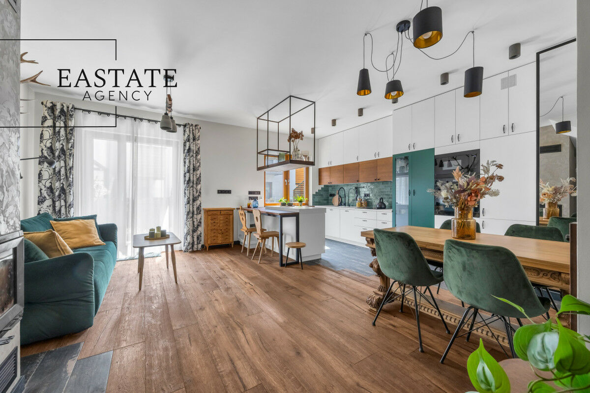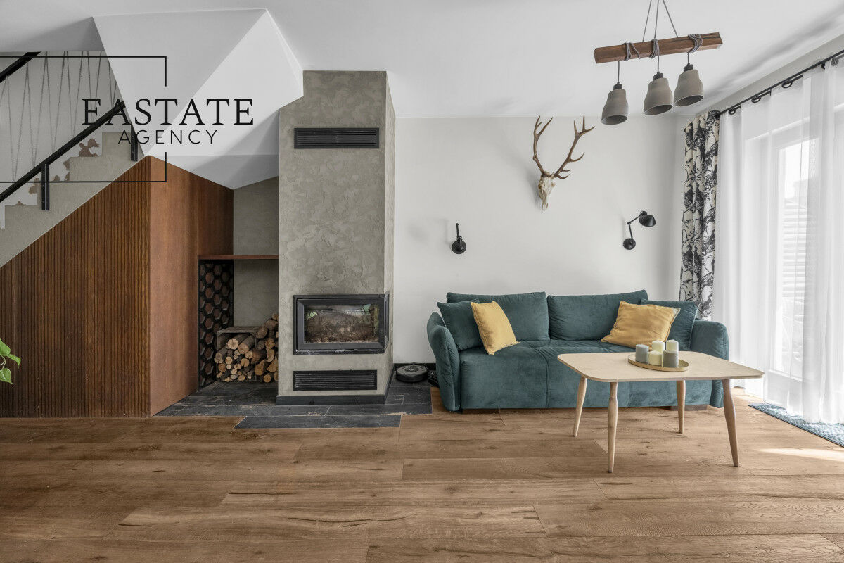 Na podłogach zastosowano drewniane podłogi, w części kuchennej na podłodze położono praktyczny gres. Uwagę zwracają również drewniane okna, kamienne parapety w pokojach na piętrze oraz schody i kominek wykończone mikrocementem.