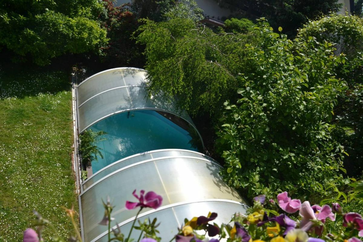 W ogrodzie stały kryty basen (rozsuwane elementy zadaszenia) o wymiarach 6,5x3,5 m, głębokość 1,4 m; woda filtrowana podgrzewana panelami solarnymi, wyposażony w przeciwprąd.