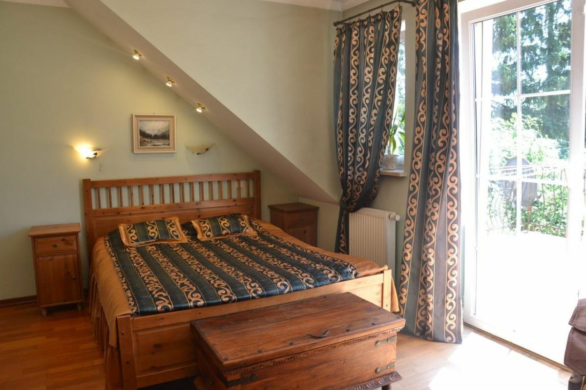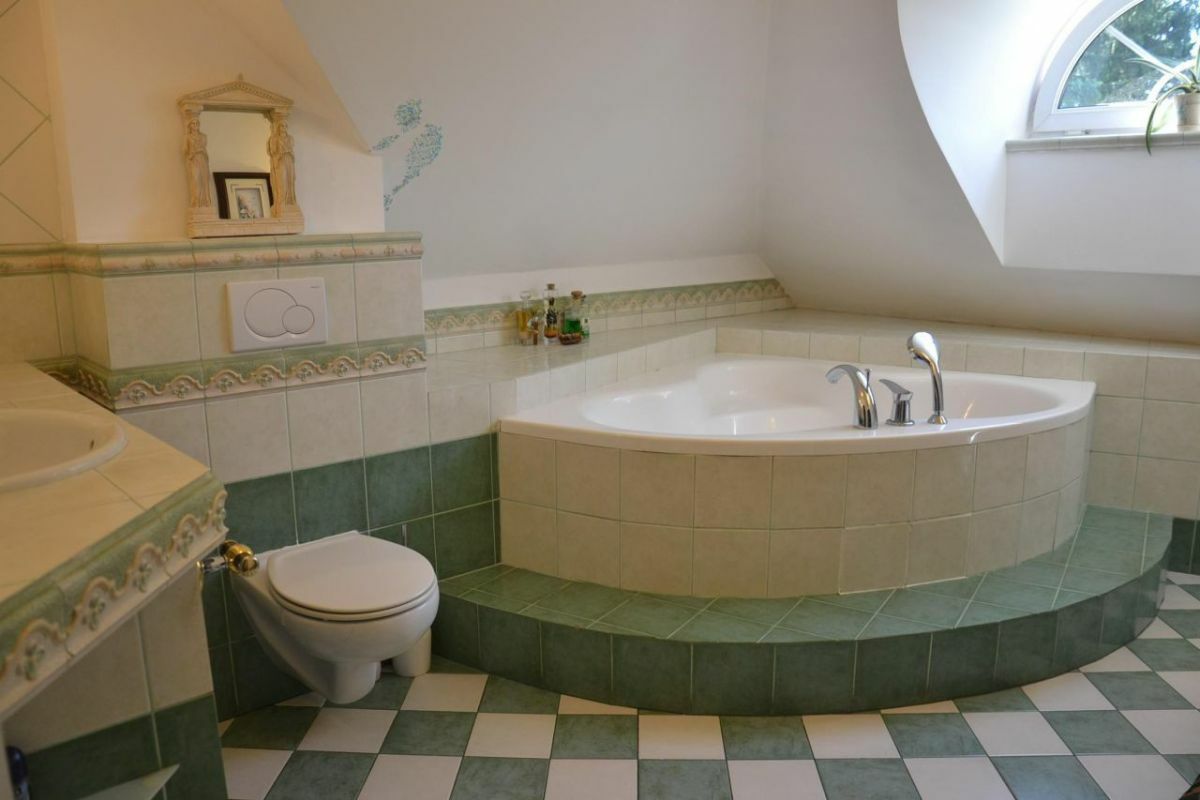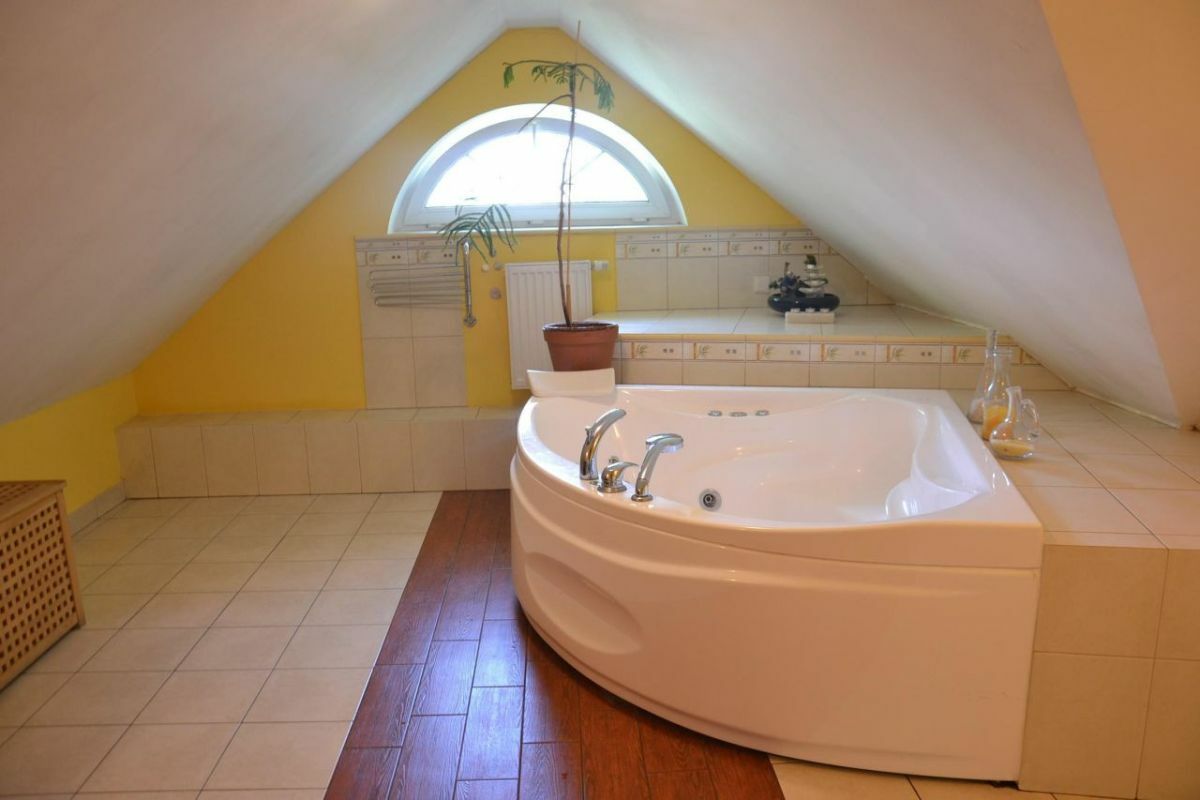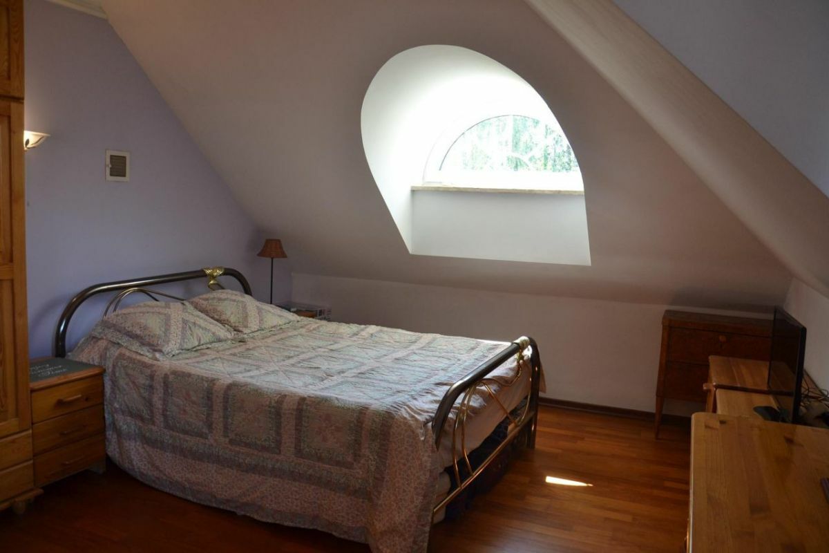 Piętro: 3 duże sypialnie (w jednej ozdobny kaflowy kominek oraz garderoba i wyjście na duży taras), 2 duże łazienki (jedna przy sypialni z garderobą, druga z jacuzzi), antresola, b. duży pokój wypoczynkowy (biblioteka).