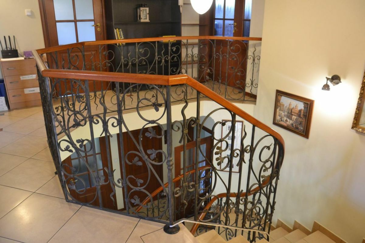 Szerokie, z ozdobną metaloplastyką i giętą poręczą schody na antresolą/hol na piętrze.