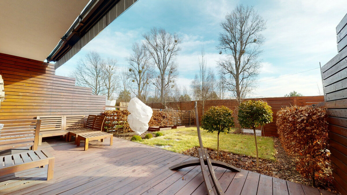 Okna domu oraz taras, balkon i ogród wychodzą na tereny zielone.