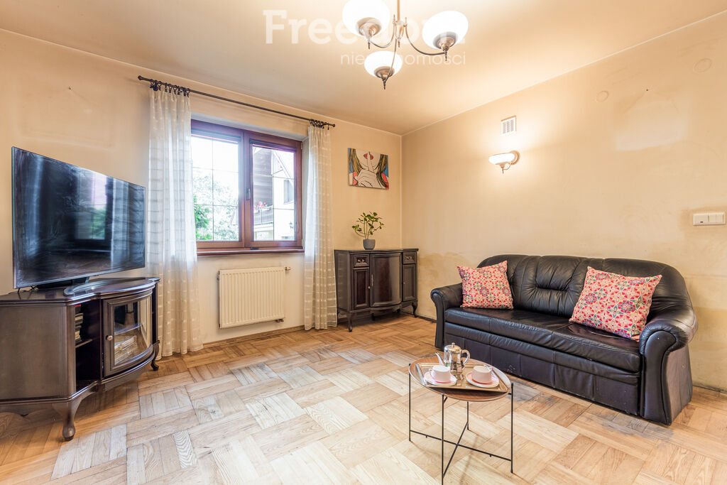 Na podłogach w salonie i pokojach położony parkiet, w kuchni, hallu
