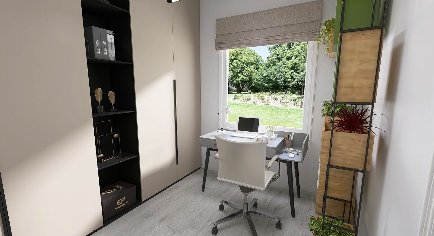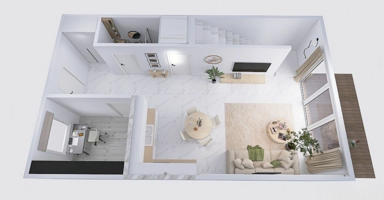 ground floor: living room, kitchenette, WC, guest room/office, technical room