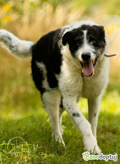 Pięknie spaceruje na smyczy, nie ciągnie, uwagę skierowaną ma na człowieka i za chwilę wolności odwdzięcza się " buziakami ".