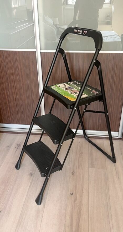 Drabina jest używana i nosi ślady eksploatacji — widoczne zarysowania na ramie i stopniach, wymaga umycia. Konstrukcja jest sprawna i stabilna, nóżki antypoślizgowe na miejscu. Oryginalna etykieta produktowa wciąż naklejona na górnym stopniu.