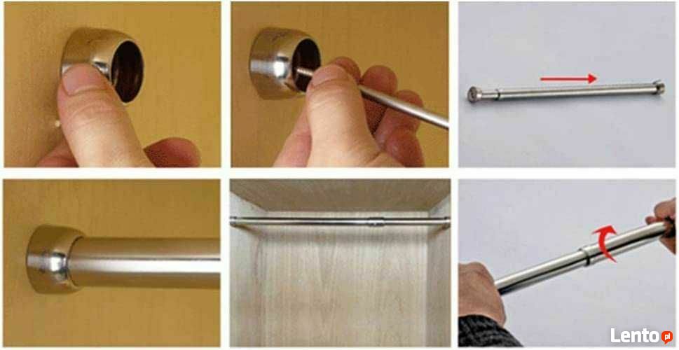 Wystarczy dobrać odpowiedni rozmiar drążka do miejsca, w którym będzie on mocowany. Końcówki drążka przykręcić do powierzchni, a następnie rozkręcać karnisz tak aby napierał na obie powierzchnie.