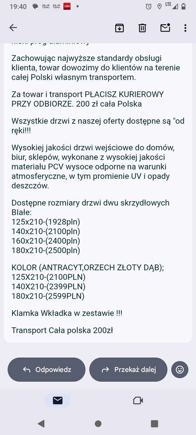 Drzwi pcv 100/210 antracyt cena 1450 zł 100/200 1400 zł 90/200 1300 90/210 1350 transport całą Polska 150 zł Płatność przy dostawieSprawdź zainteresowanie tym ogłoszeniem