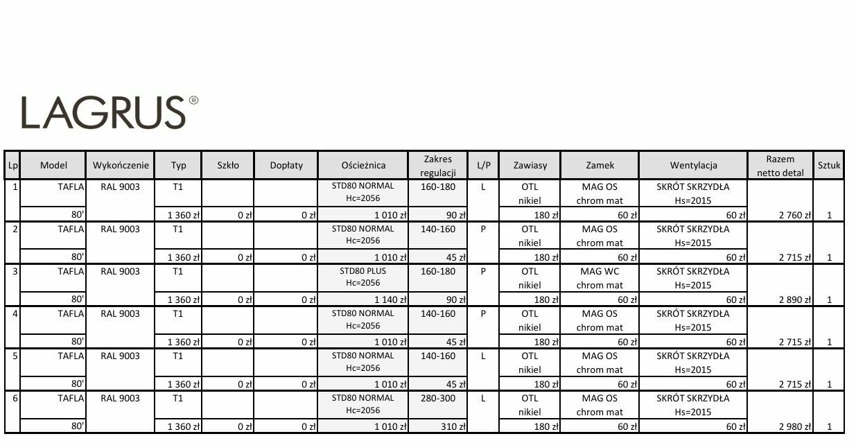 Dzień dobry,w wyniku pomyłki sprzedawcy, mamy do wyprzedania drzwi wewnętrzne bez przylgowe firmy LAGRUS, model TAFLA T1 (pełne, gładkie) lakierowane, białe matowe, 80, ze skrótem rekuperacyjnym, wraz z ościeżnicami dla grubości murów od 140-300cm wg specyfikacji jak niżej.