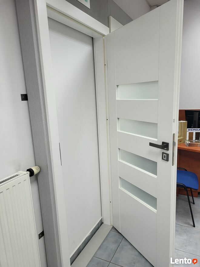 Drzwi powystawowe bez uszkodzeń w komplecie z klamką.