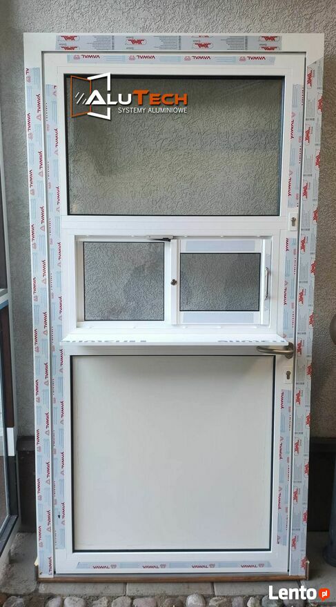 Podana cena netto - 4700 zł dotyczy drzwi o rozm. 900 x 2100 z oknem podawczym, parapet, zamek , klamka, kolor RAL 9016.Wypelnienie - szyba 33.1 (bezpieczna ) , panel.