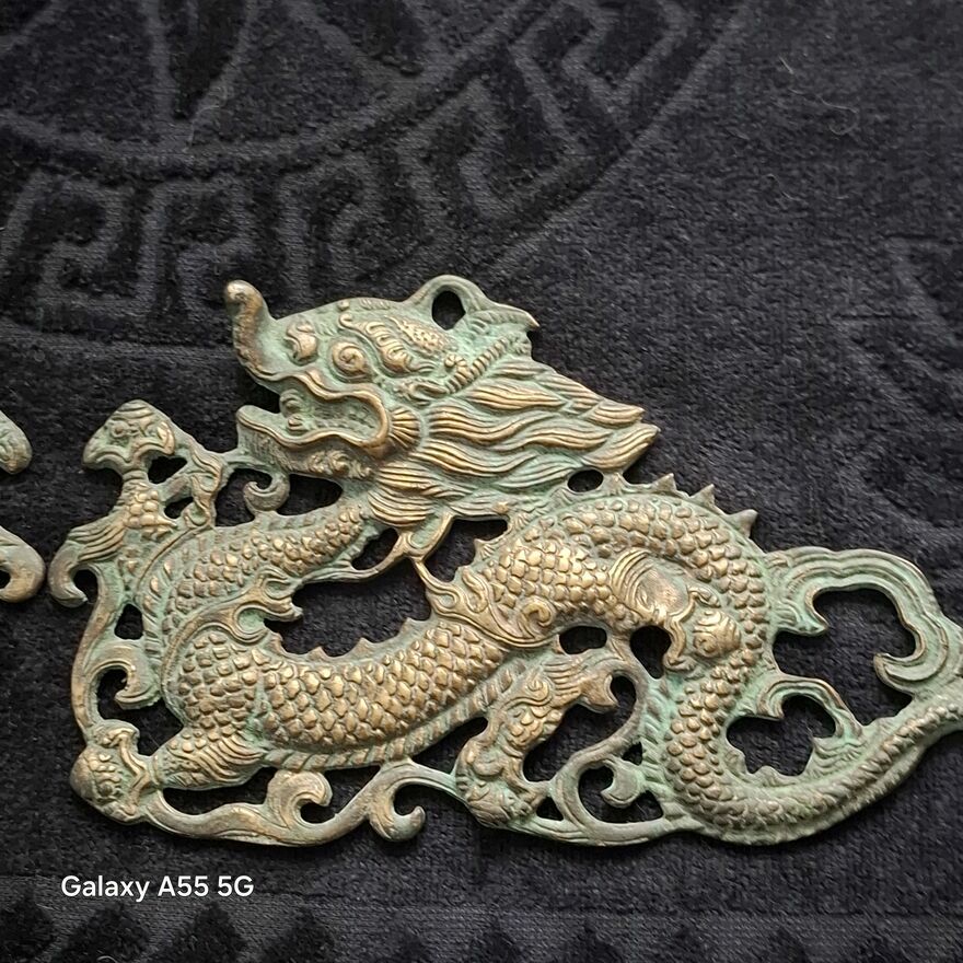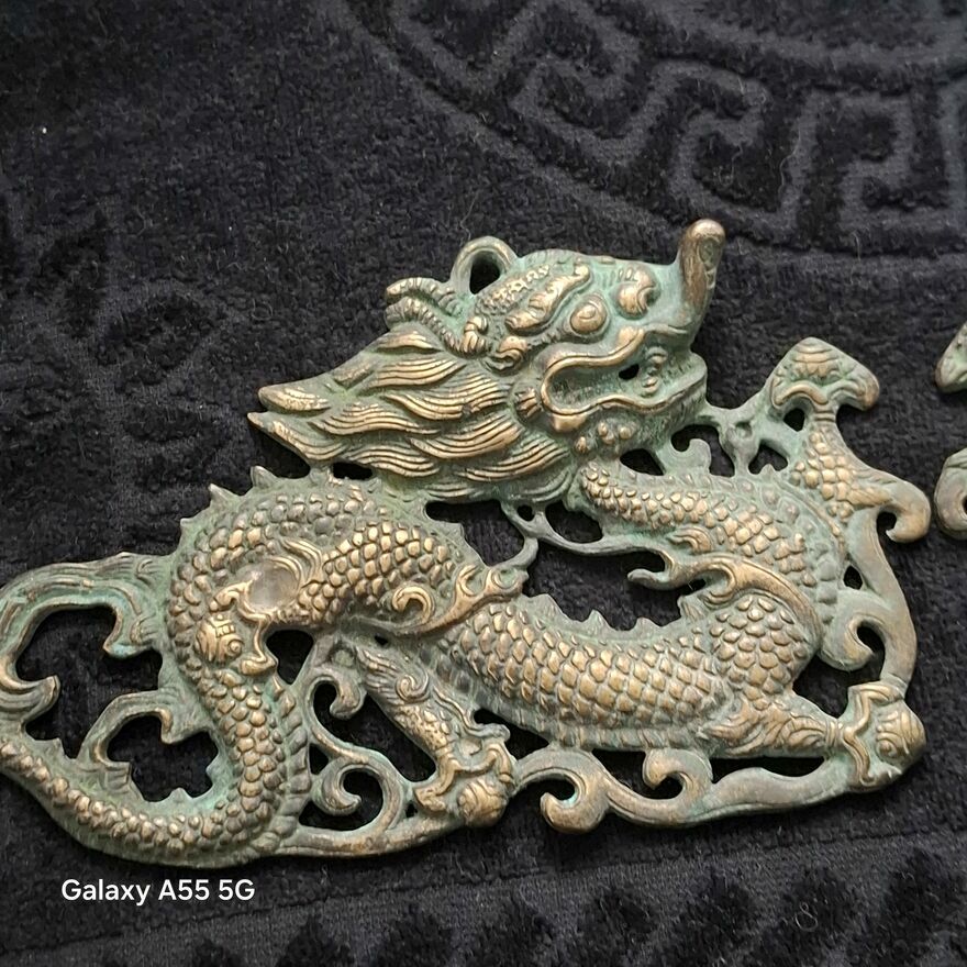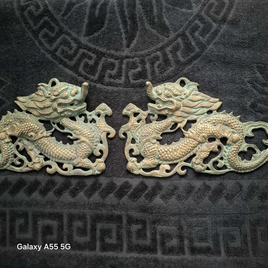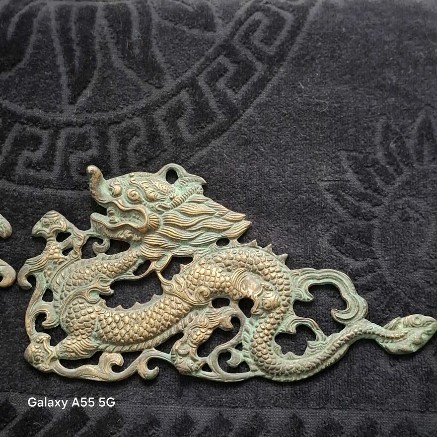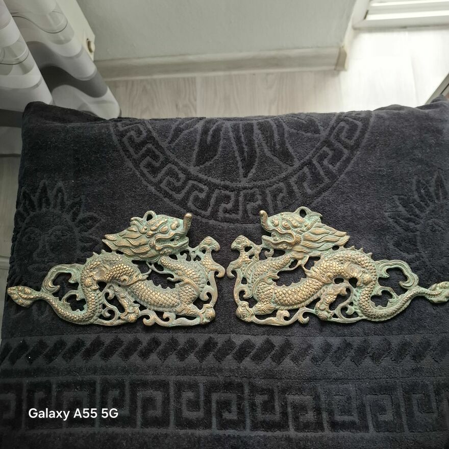 Zestaw dekoracji ściennych z mosiądzu w stylu vintage z motywem smoka, 2 chińskie dzieła sztuki .Stan bdb.Smoki pokryte patyną.Cena za 2 zawieszki.Sprawdź zainteresowanie tym ogłoszeniem