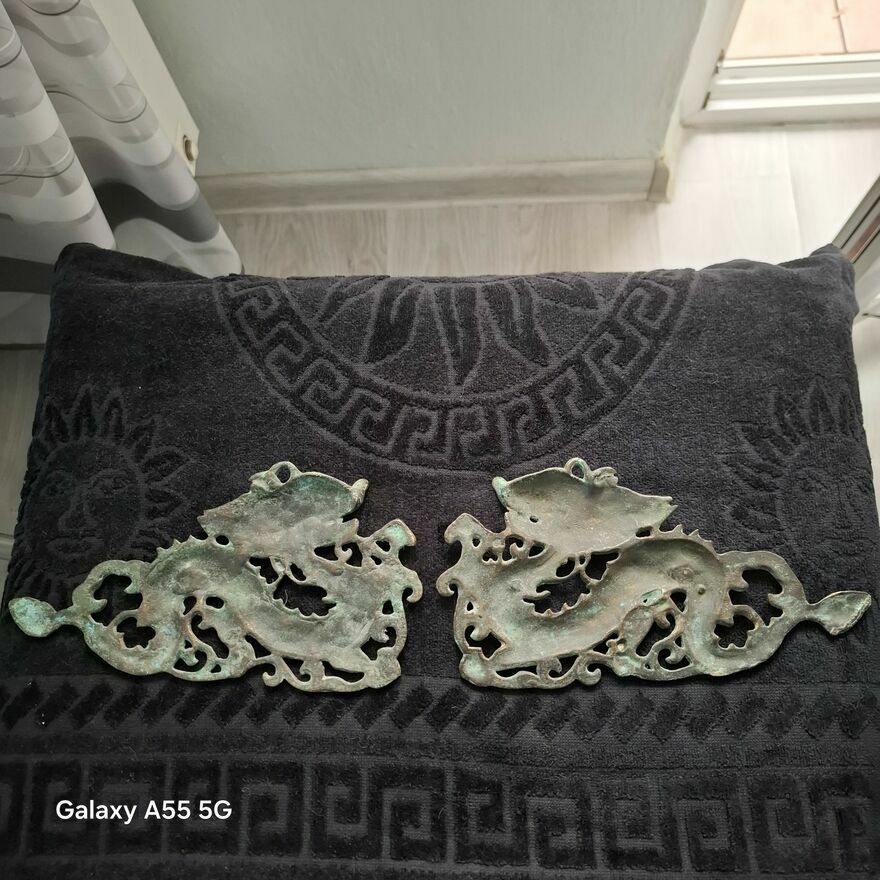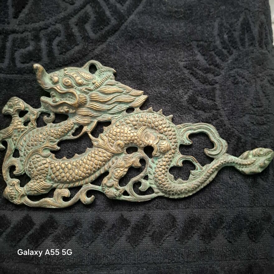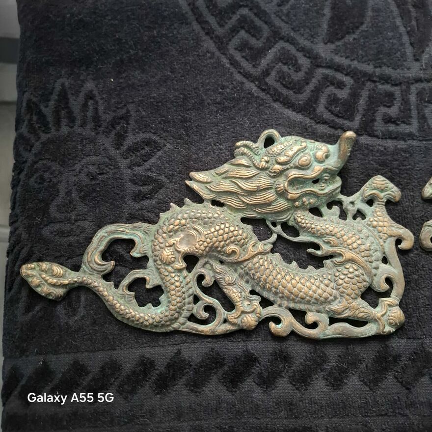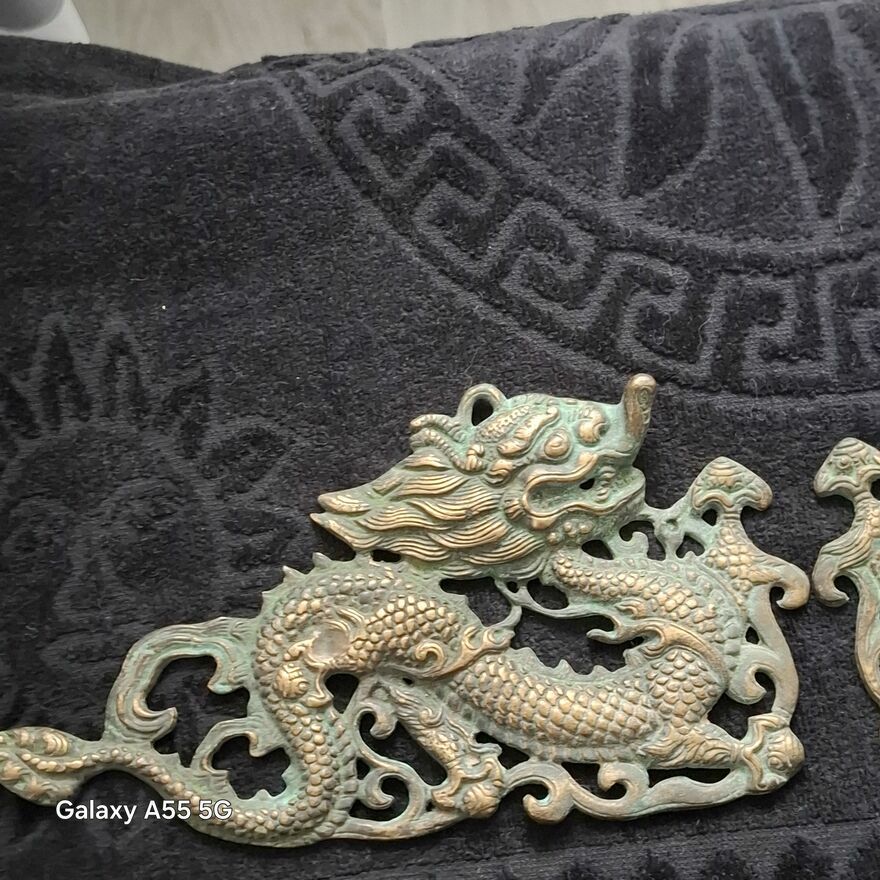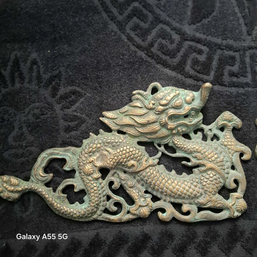 Zestaw dekoracji ściennych z mosiądzu w stylu vintage z motywem smoka, 2 chińskie dzieła sztuki .Stan bdb.Smoki pokryte patyną.Cena za 2 zawieszki.Sprawdź zainteresowanie tym ogłoszeniem