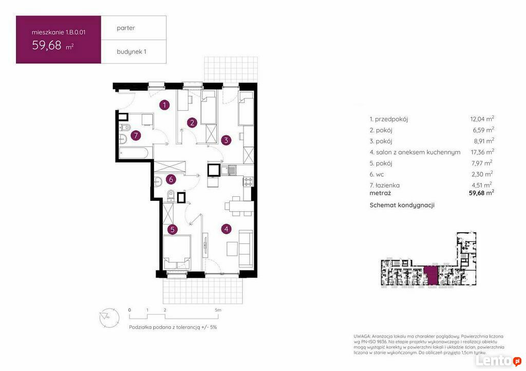 Parterowe mieszkanie o powierzchni 59,68 m2 z dwoma ogródkami.